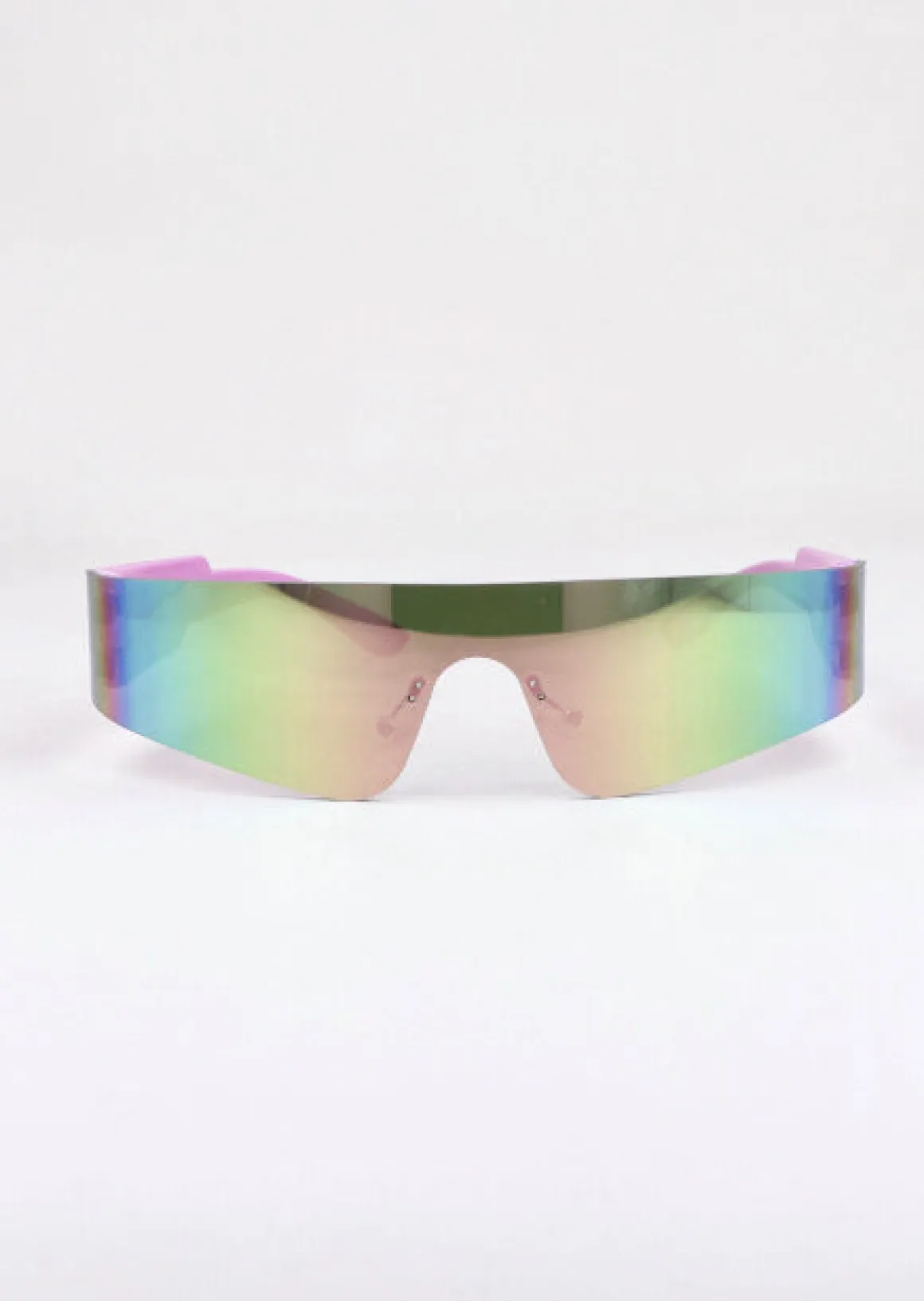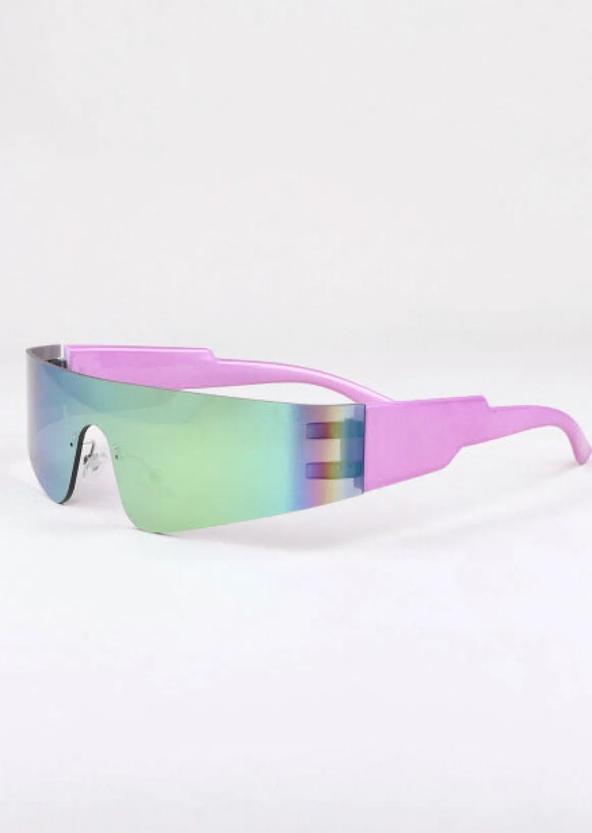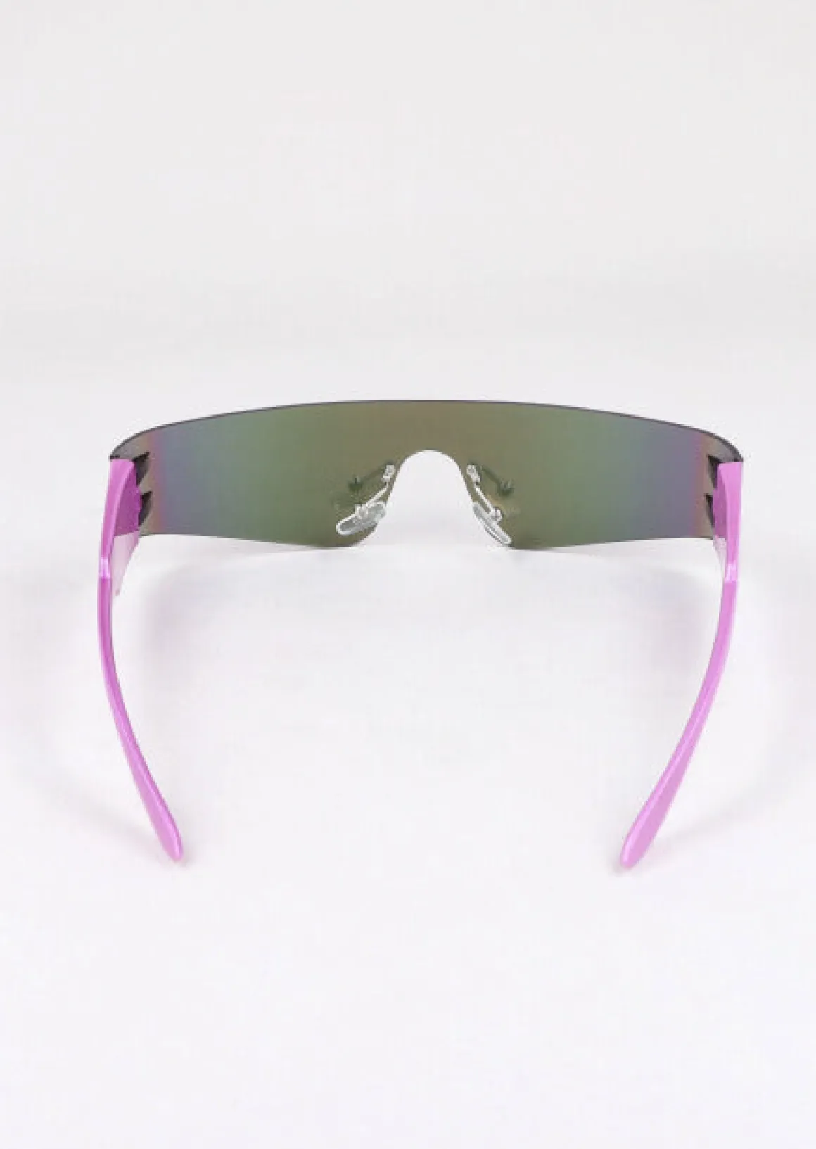 Lentes deportivos delgados con mica holográfica, almohadillas transparentes y patas anchas..