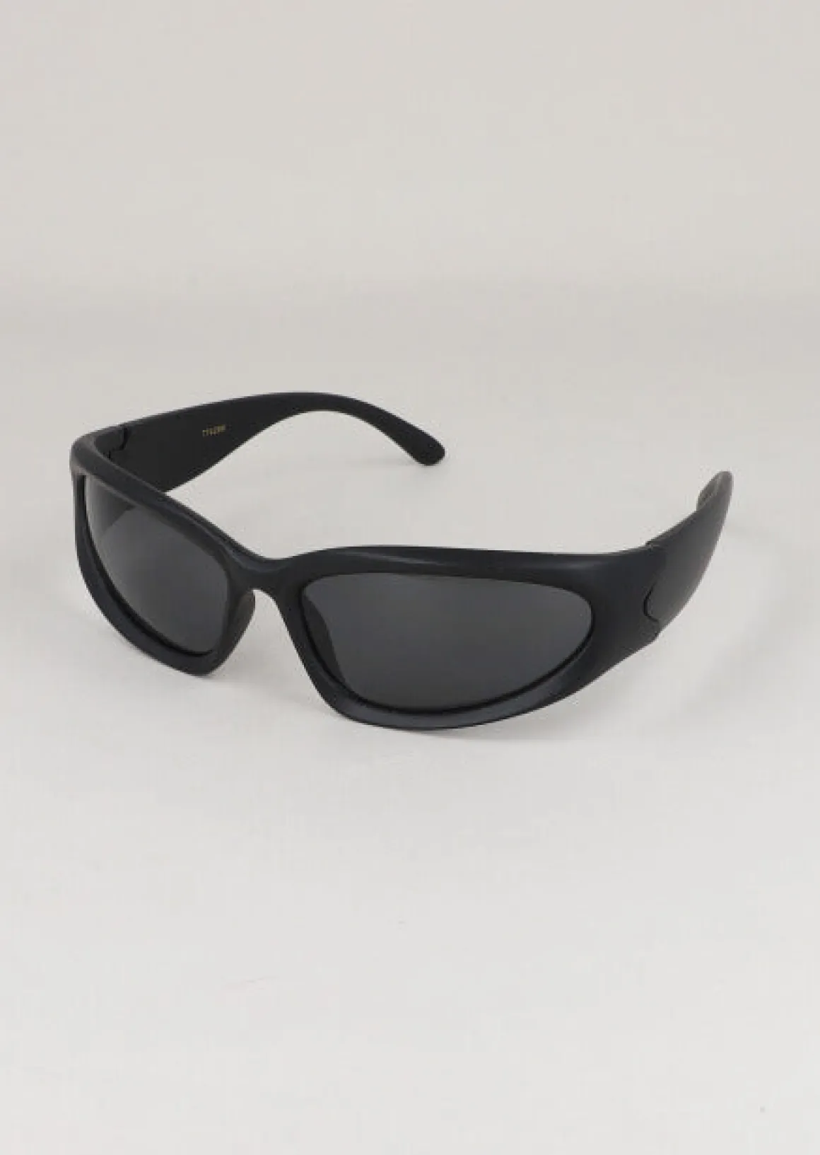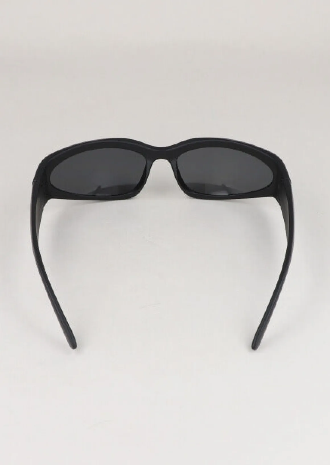 Lentes de sol aerodinámicos con micas oscuras. Patillas gruesas.