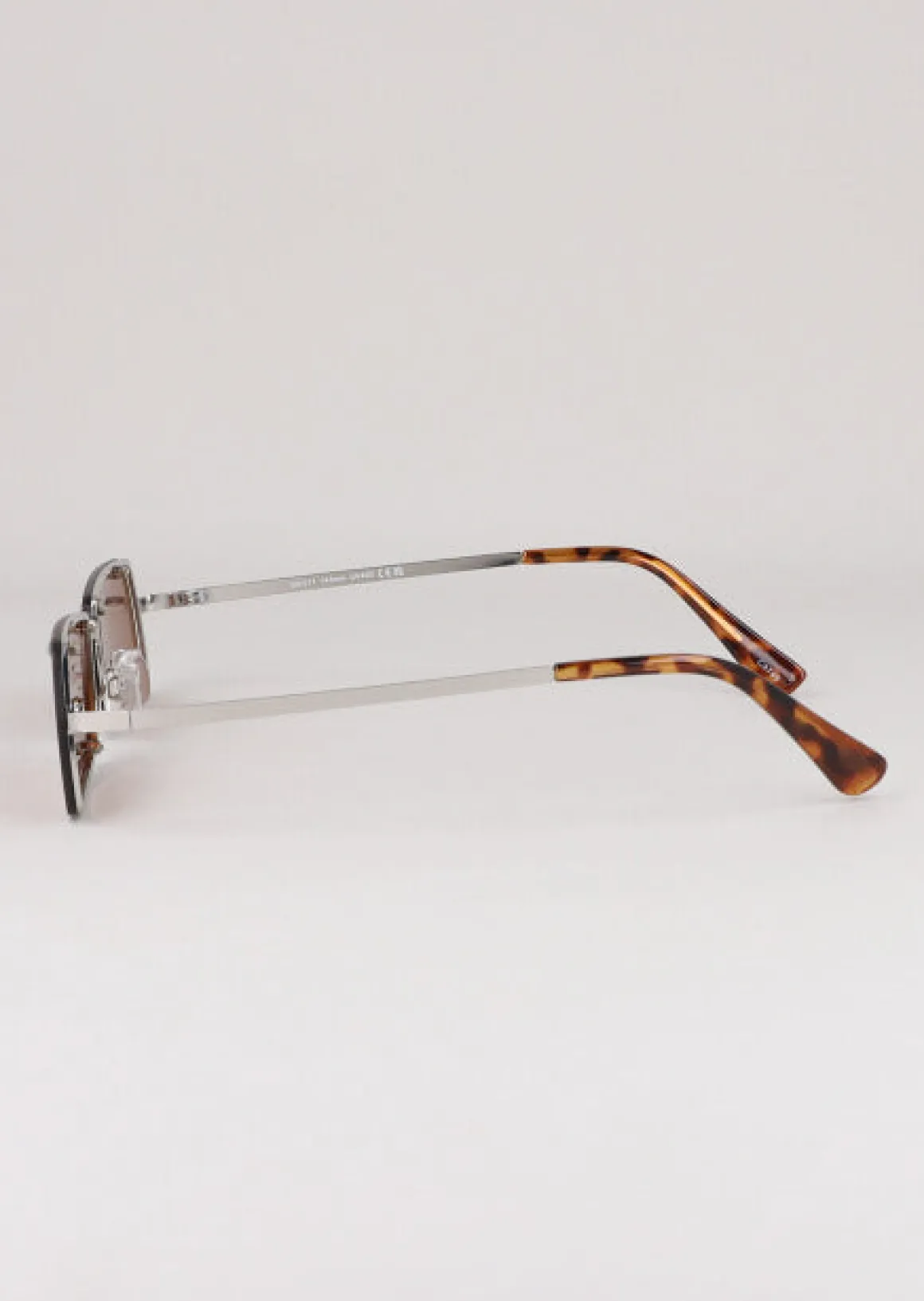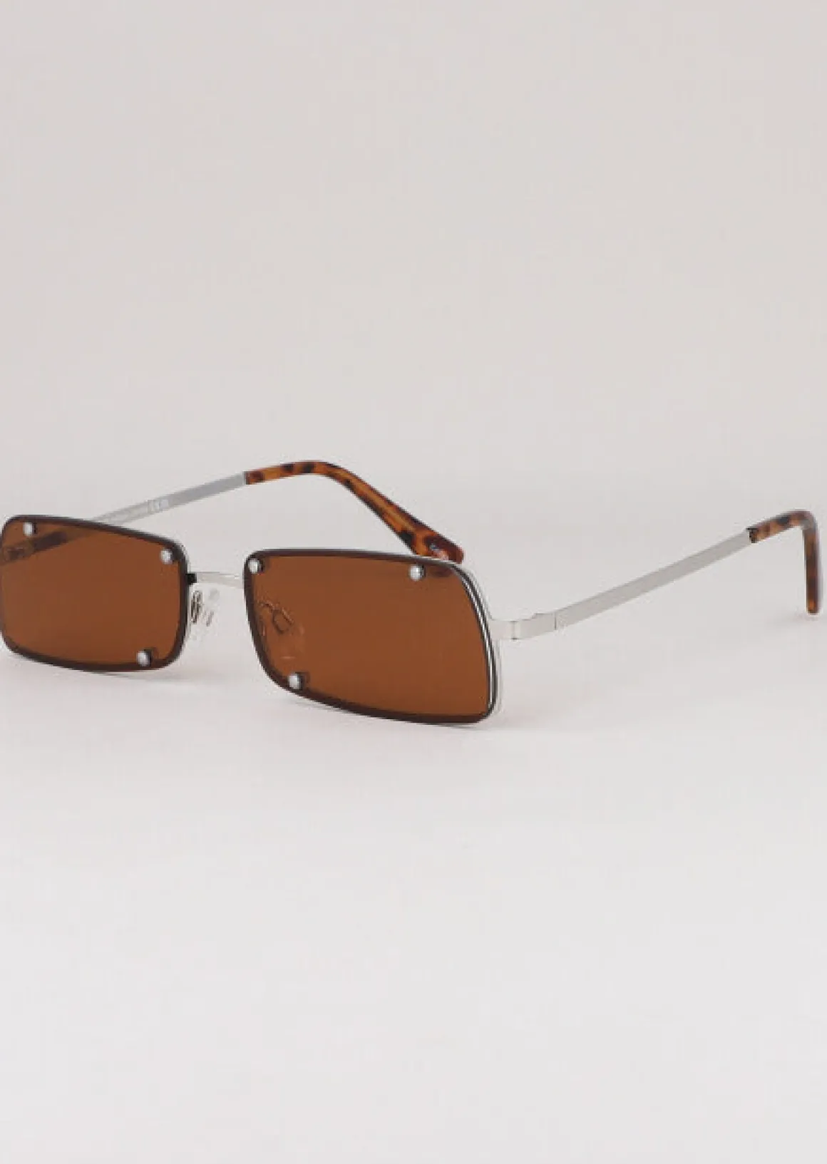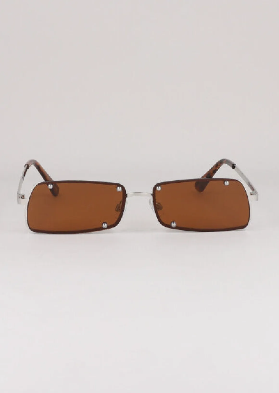 Lentes de sol rectangulares con estoperoles en el marco. Armazon delgado y metálico..
