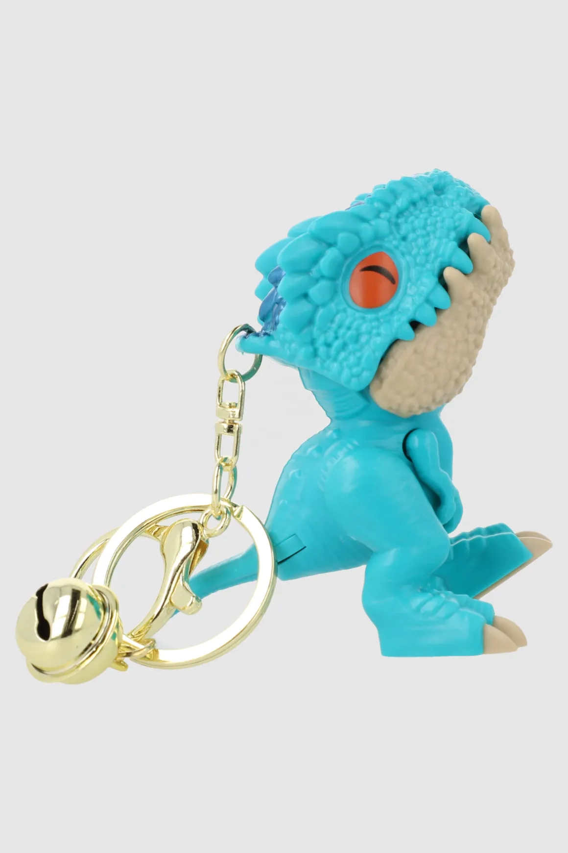 Llavero en forma de dinosaurio de plástico con cascabel.