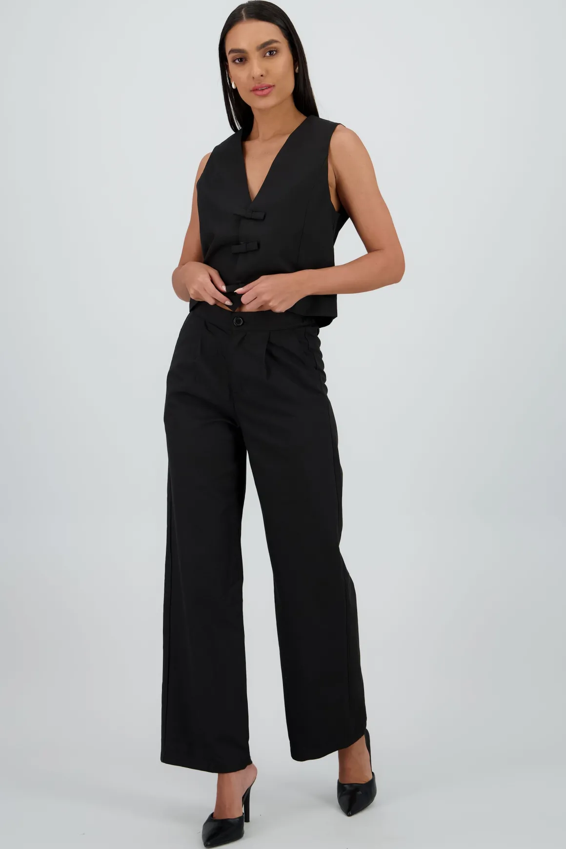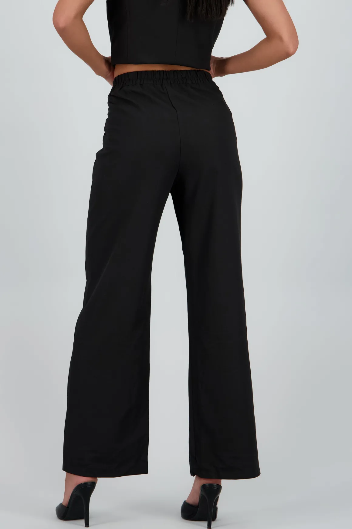Pantalón sastre wide leg, corte amplio, cintura alta y detalle de pinzas.