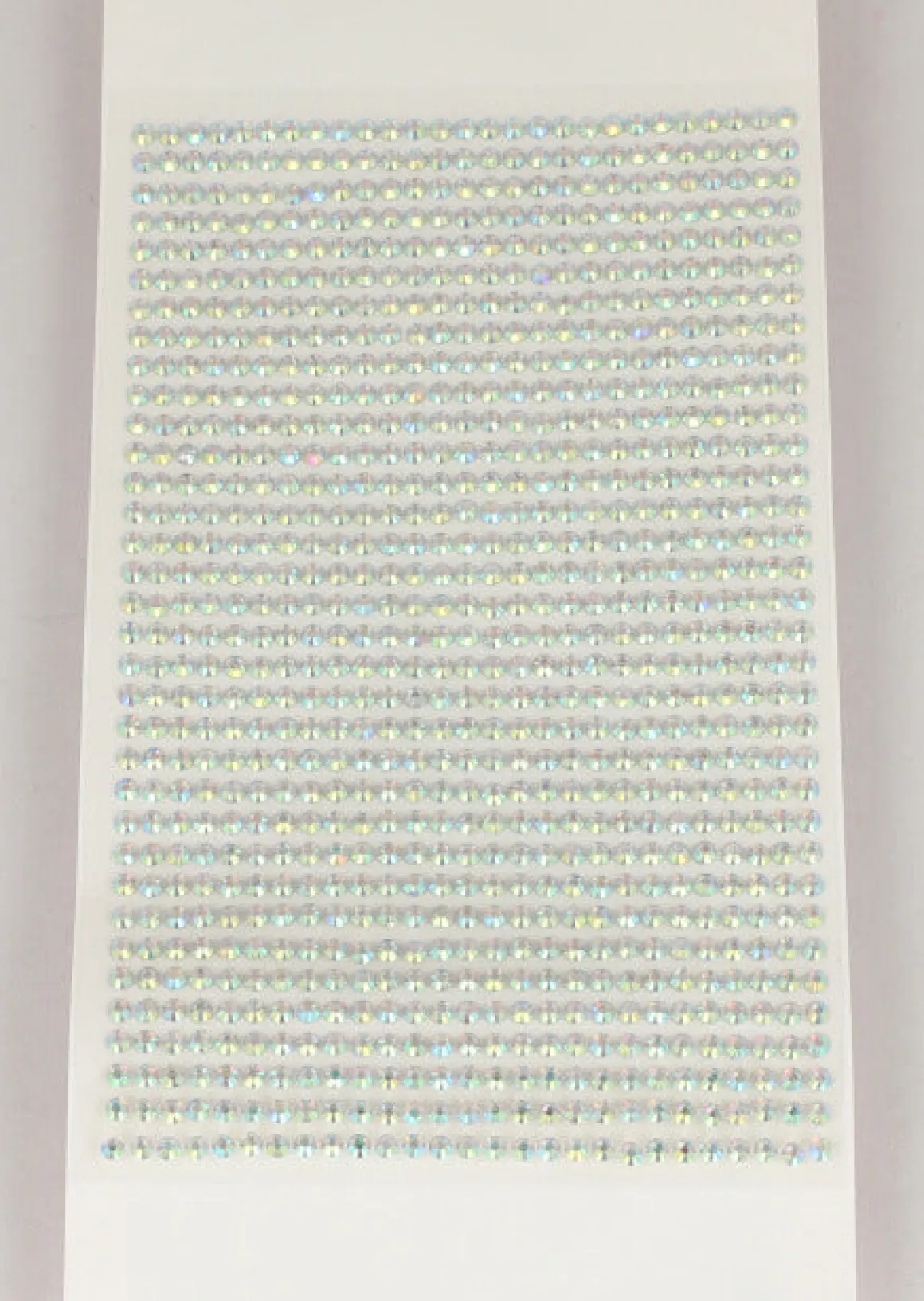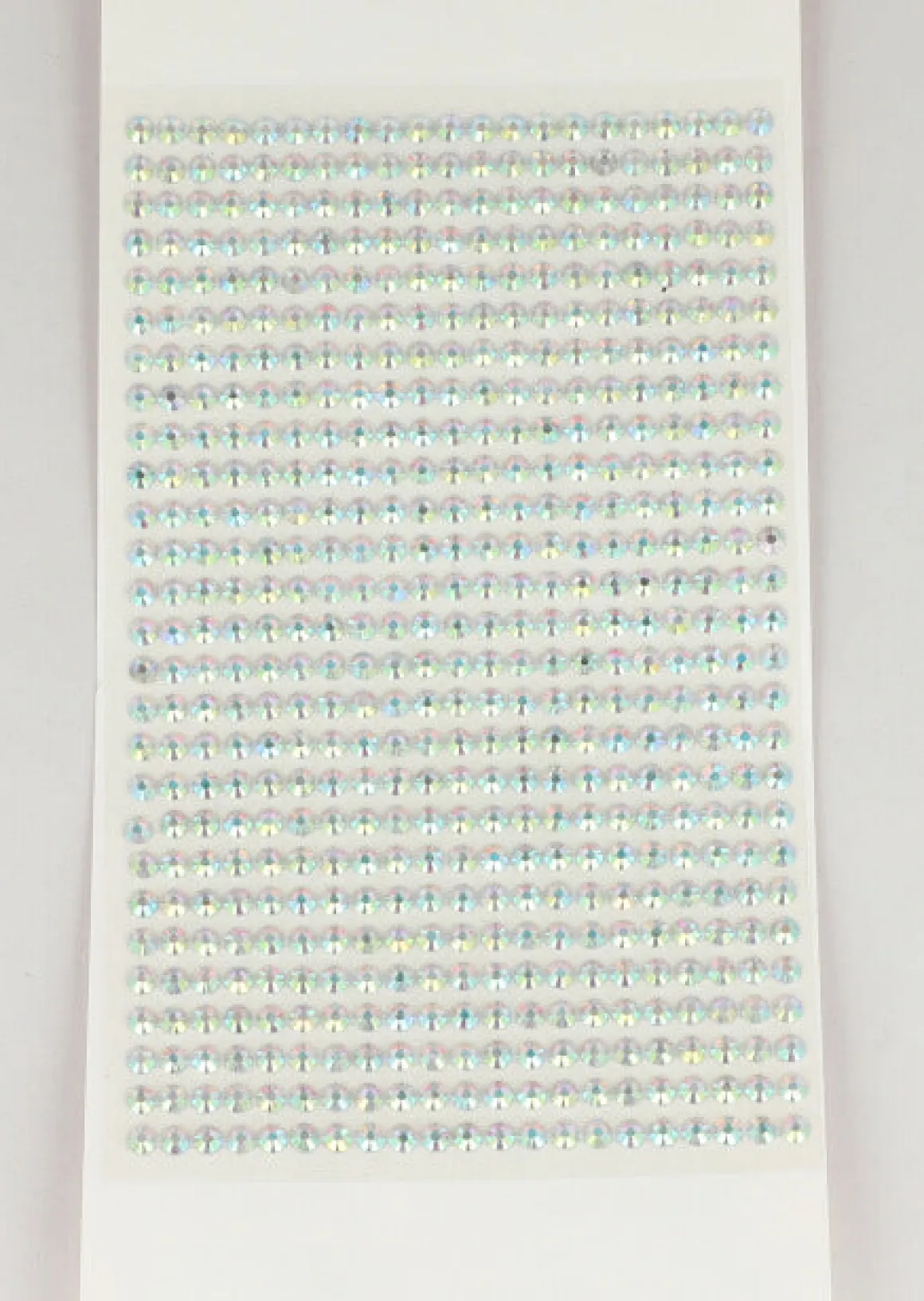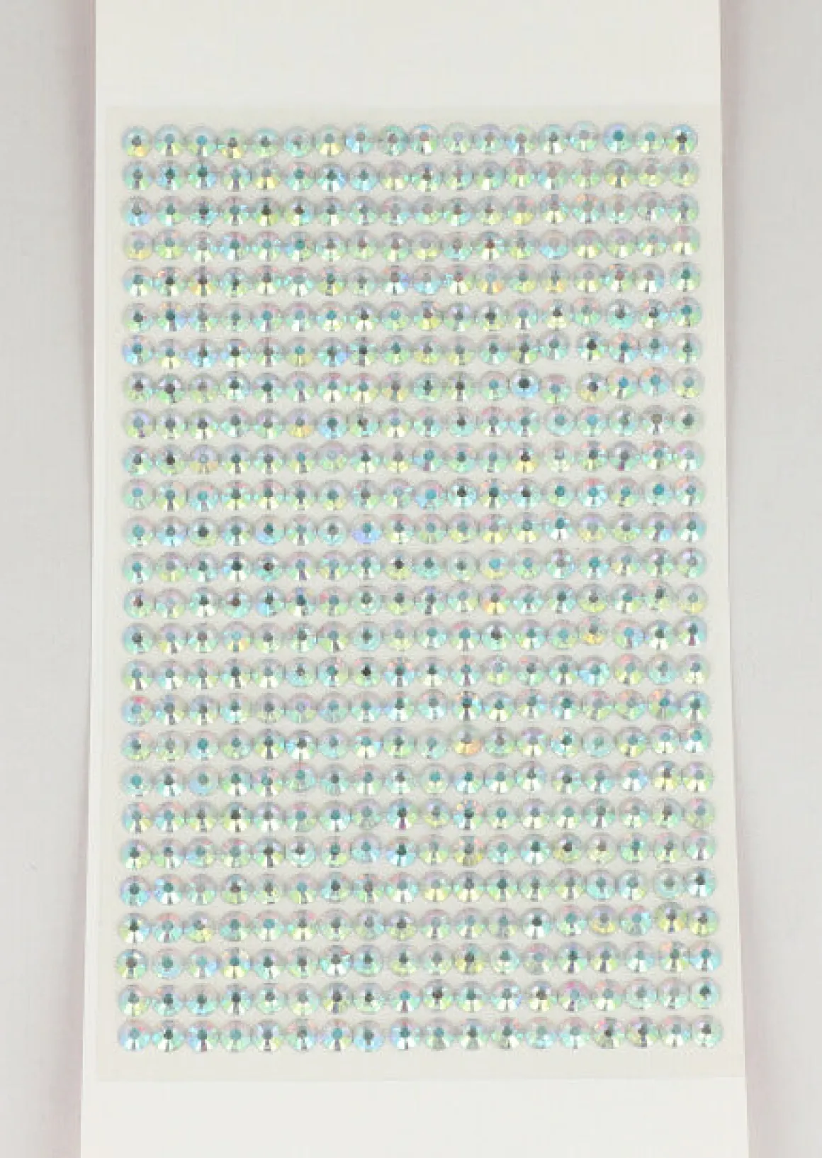 Una hoja de pegatina con gemas faciales circulares de brillos con efecto tornasol.