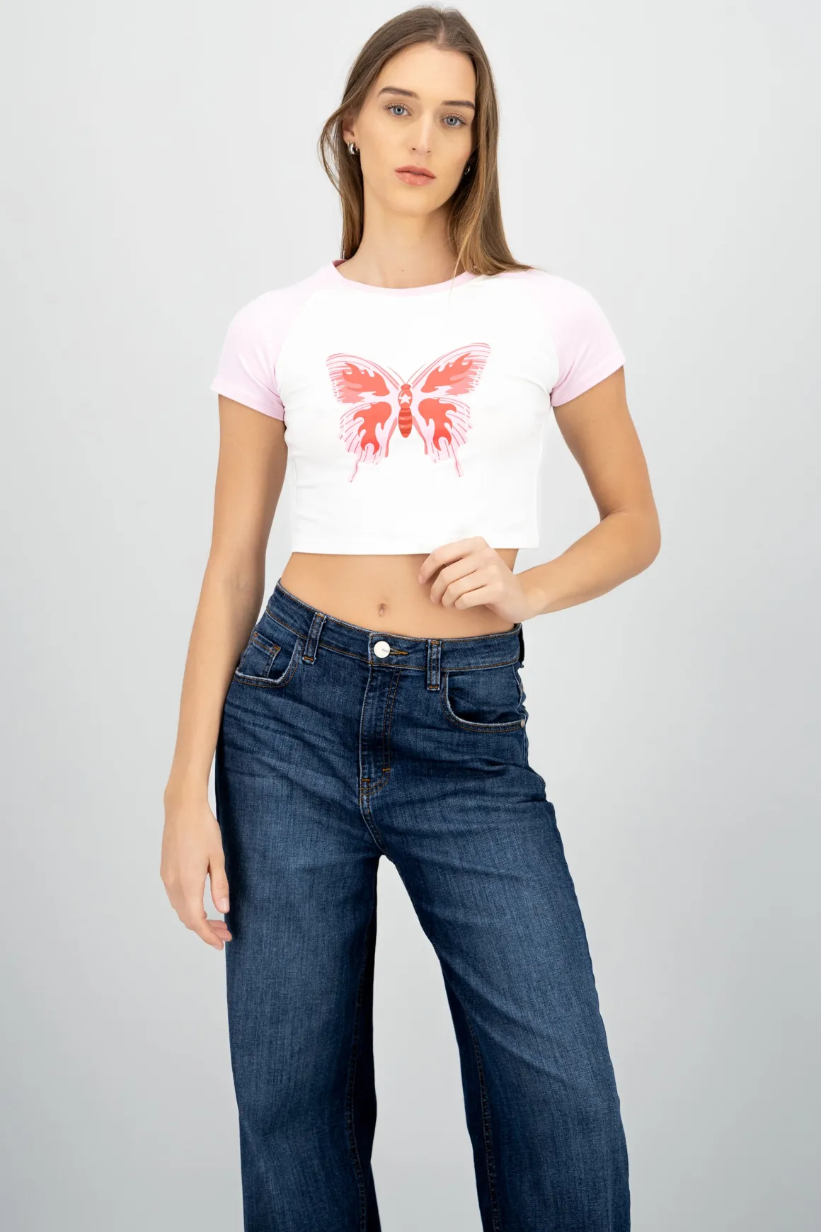 Esta playera crop es el complemento perfecto para cualquier outfit, ideal para días soleados o esas salidas con amigos. Su estampado de mariposas le da un toque único que resalta tu look.