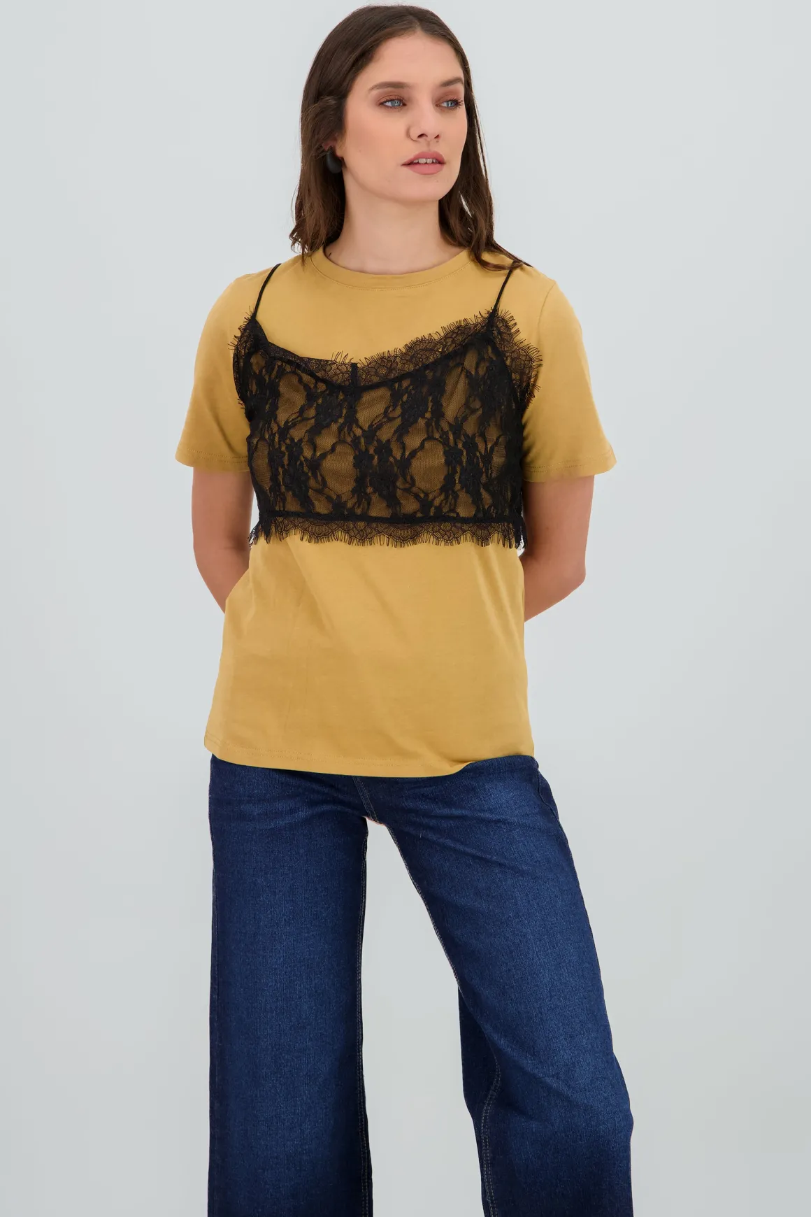 Perfecta para esos días donde quieres estar cómoda pero con estilo, esta playera se adapta a cualquier ocasión. Con un toque de encaje que le da un giro especial, es ideal para crear outfit únicos y llenos de personalidad.