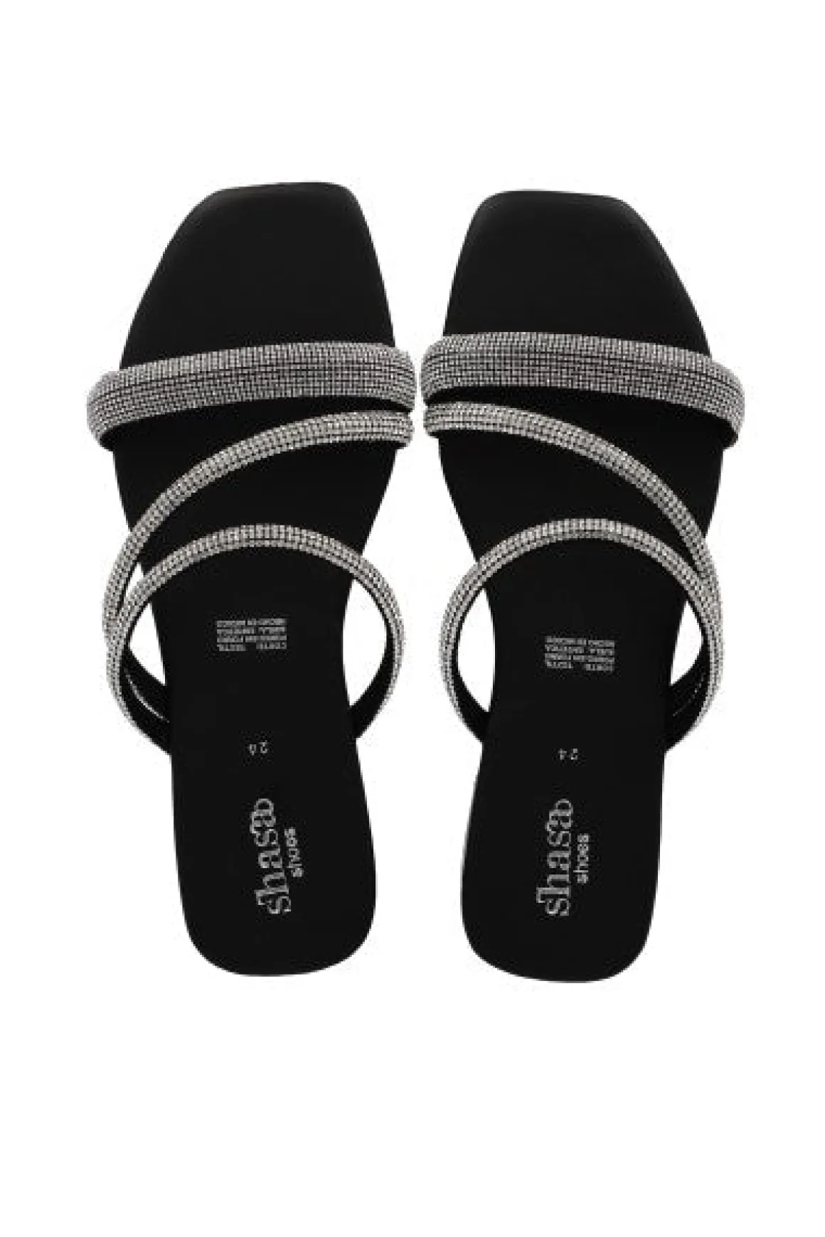 Sandalia plana de tiras cruzadas con aplicación de multi brillos en empiene.