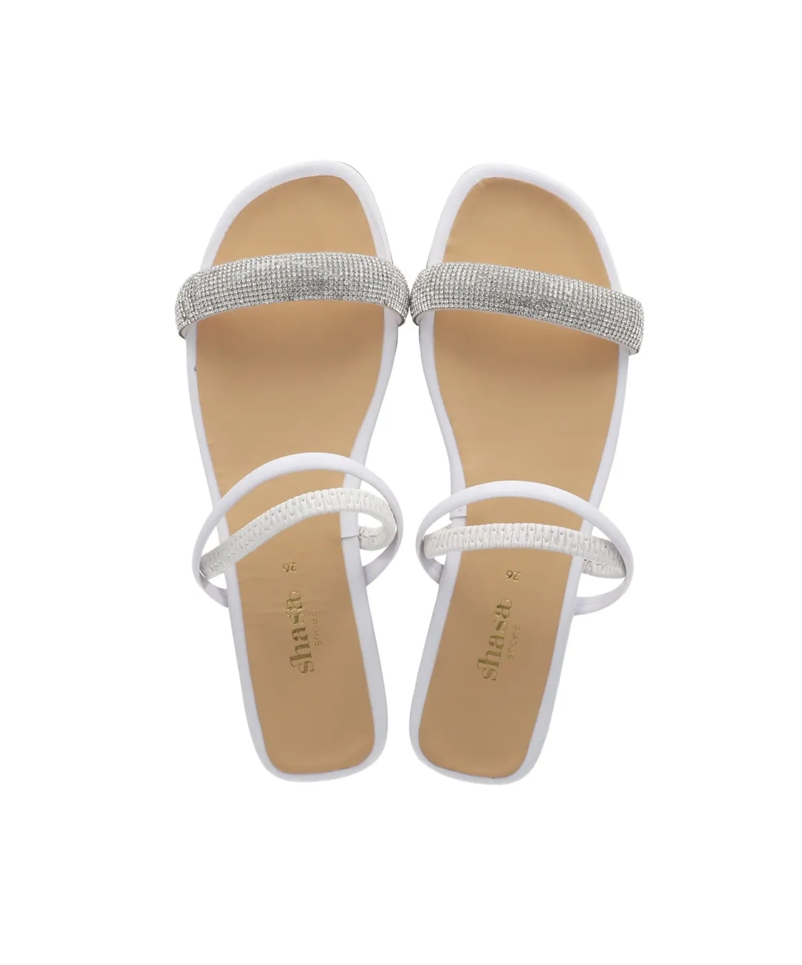 Sandalia con tiras cruzadas y cinta ancha con aplicación de brillos.
