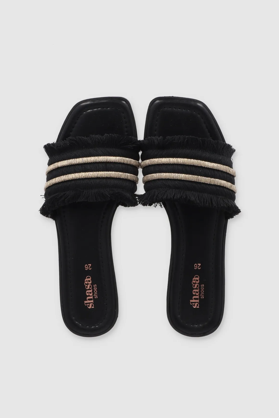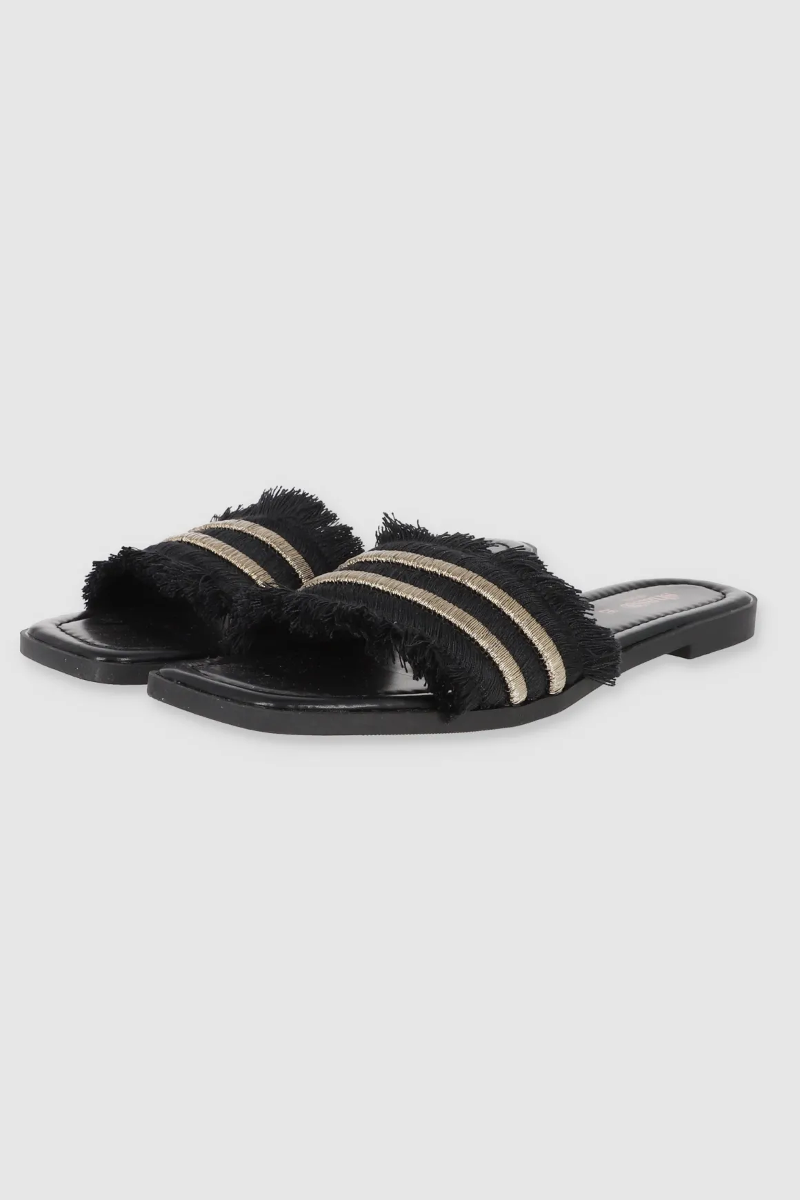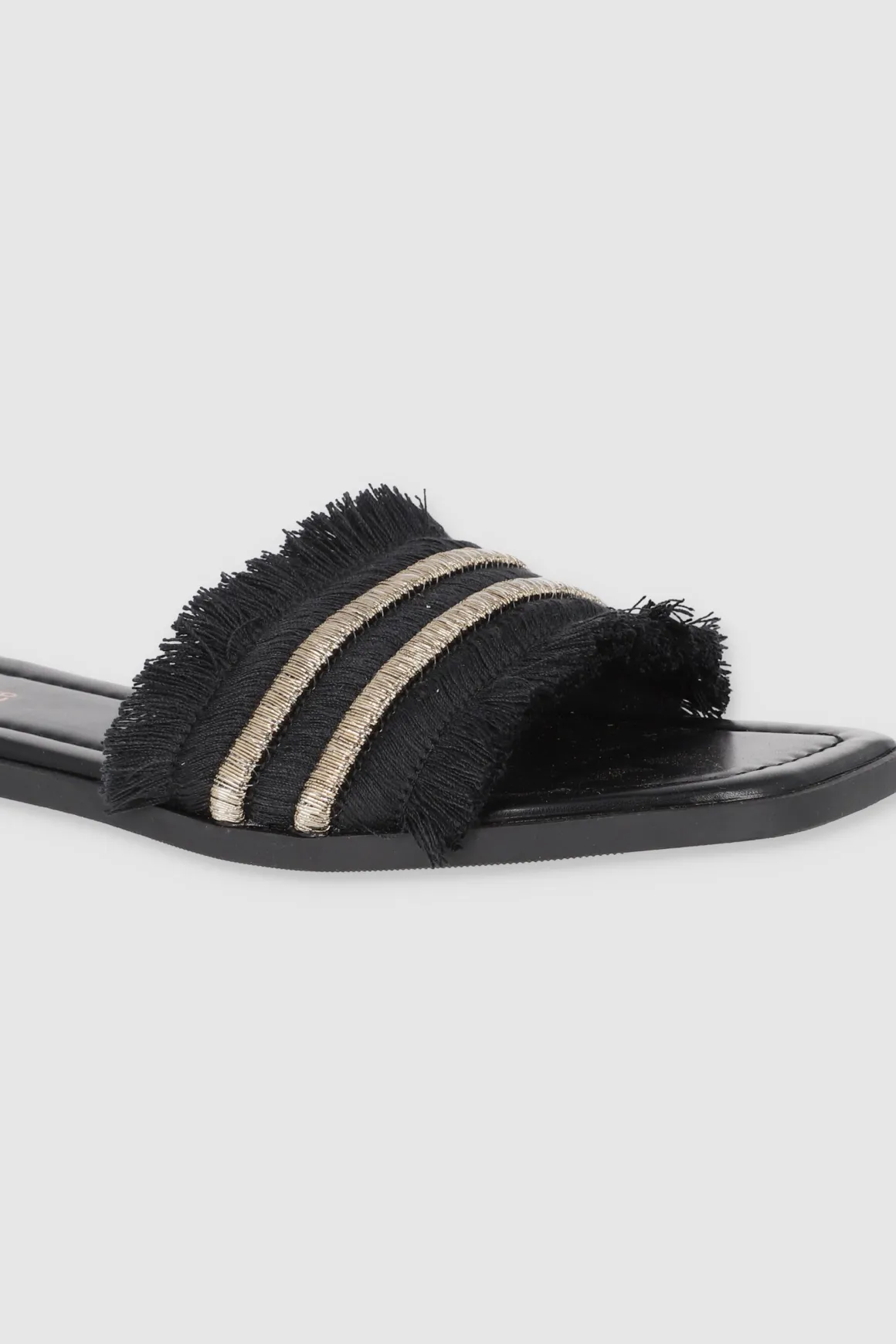 Dale un toque cool a tu outfit con nuestras sandalias planas, perfectas para cualquier plan. Estas sandalias tienen una cinta ancha superior que aporta comodidad y estilo. Los bordes de la cinta están decorados con detalles de flecos que le dan un toque boho, mientras que la tira doble de brillos añade un toque chic y llamativo. Combínalas con tus jeans favoritos o un vestido de verano.