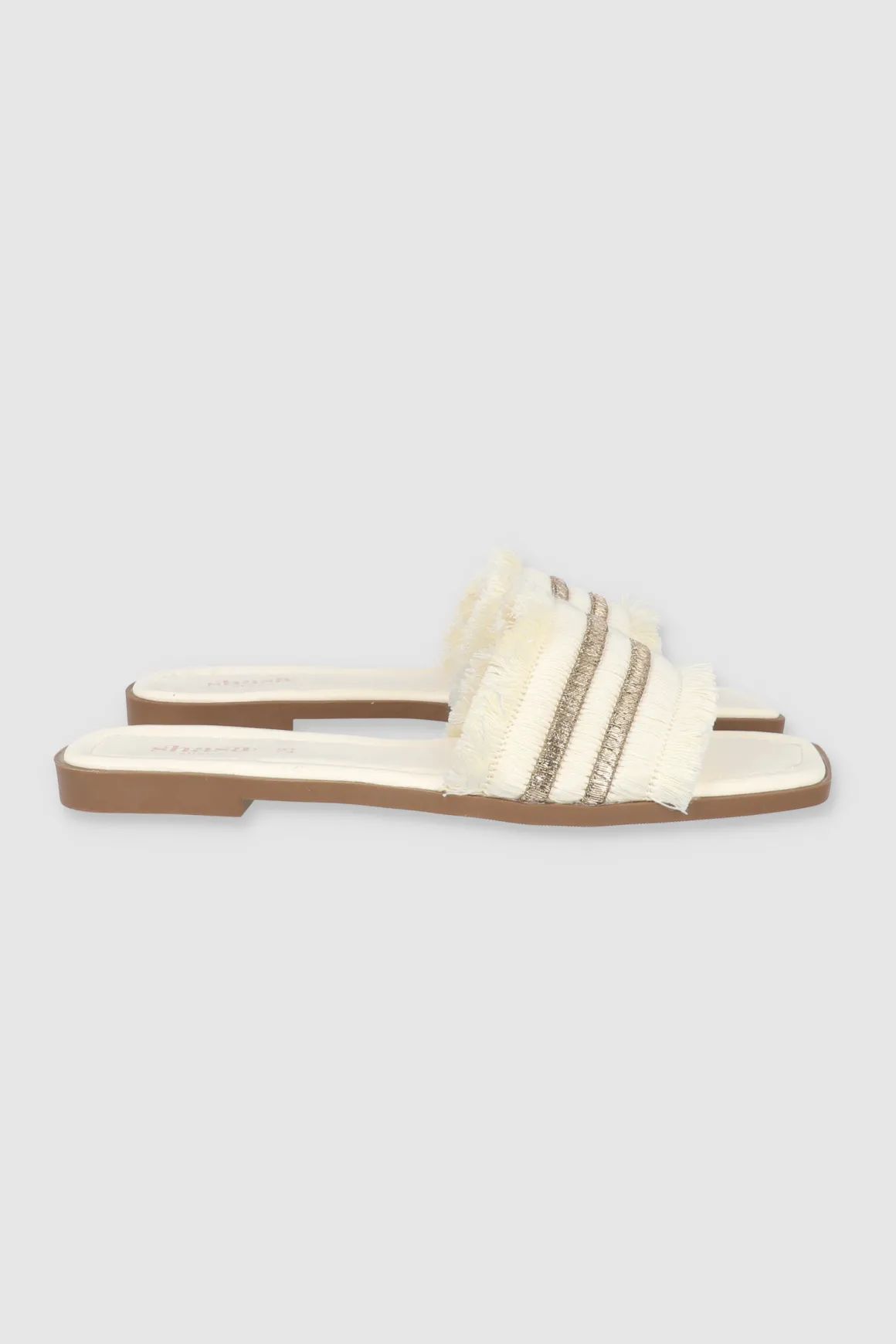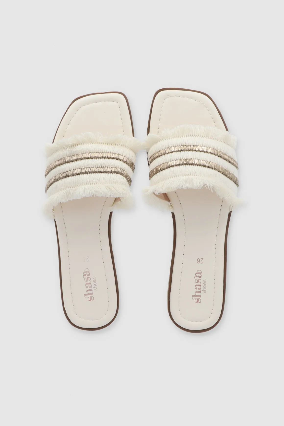 Dale un toque cool a tu outfit con nuestras sandalias planas, perfectas para cualquier plan. Estas sandalias tienen una cinta ancha superior que aporta comodidad y estilo. Los bordes de la cinta están decorados con detalles de flecos que le dan un toque boho, mientras que la tira doble de brillos añade un toque chic y llamativo. Combínalas con tus jeans favoritos o un vestido de verano.