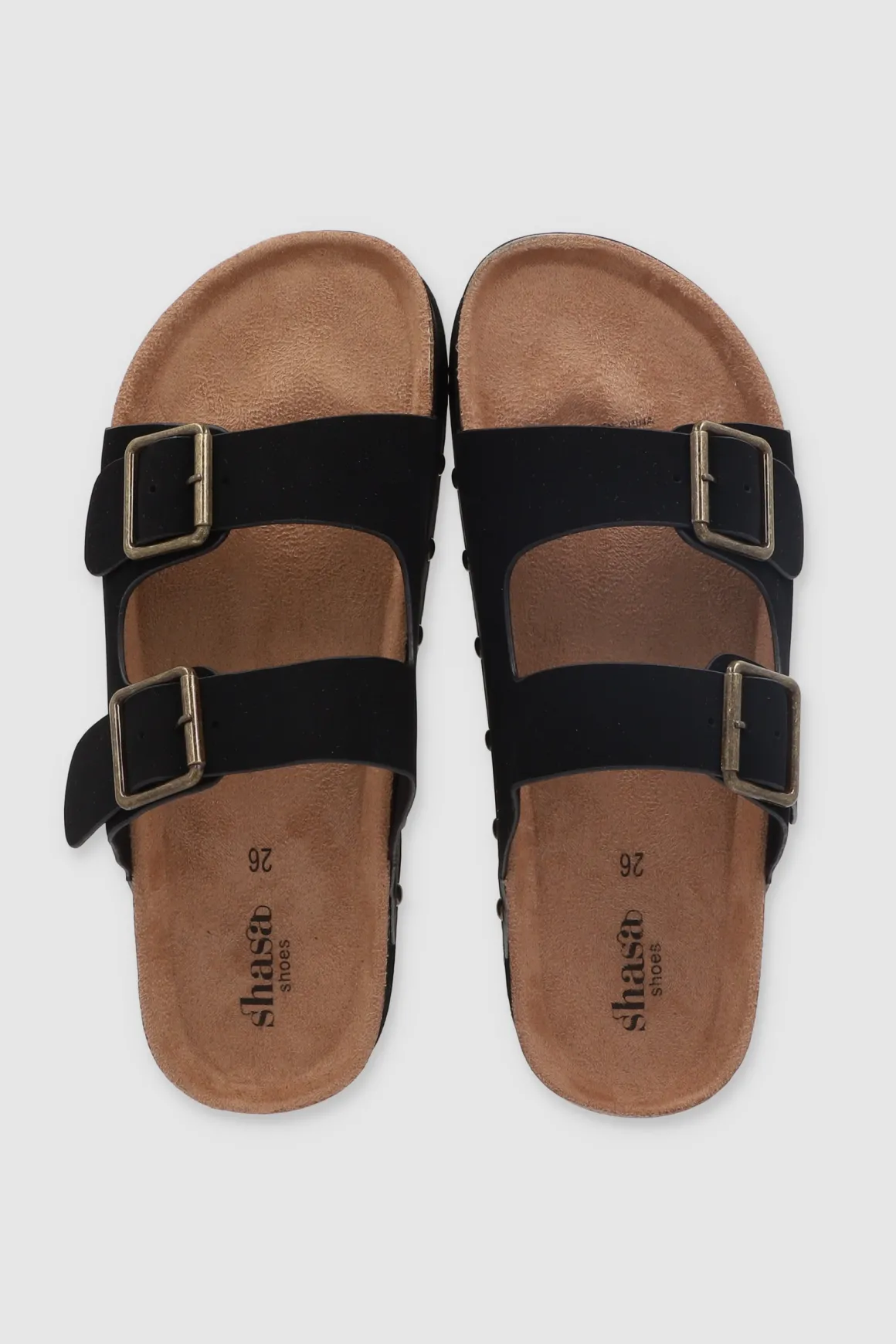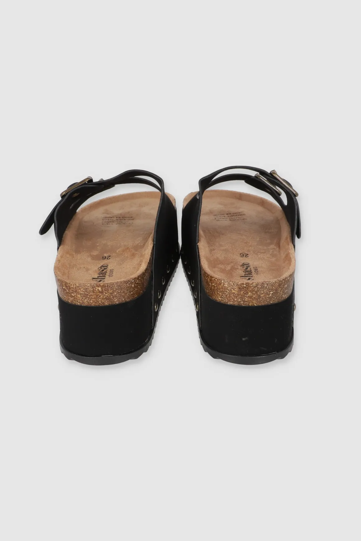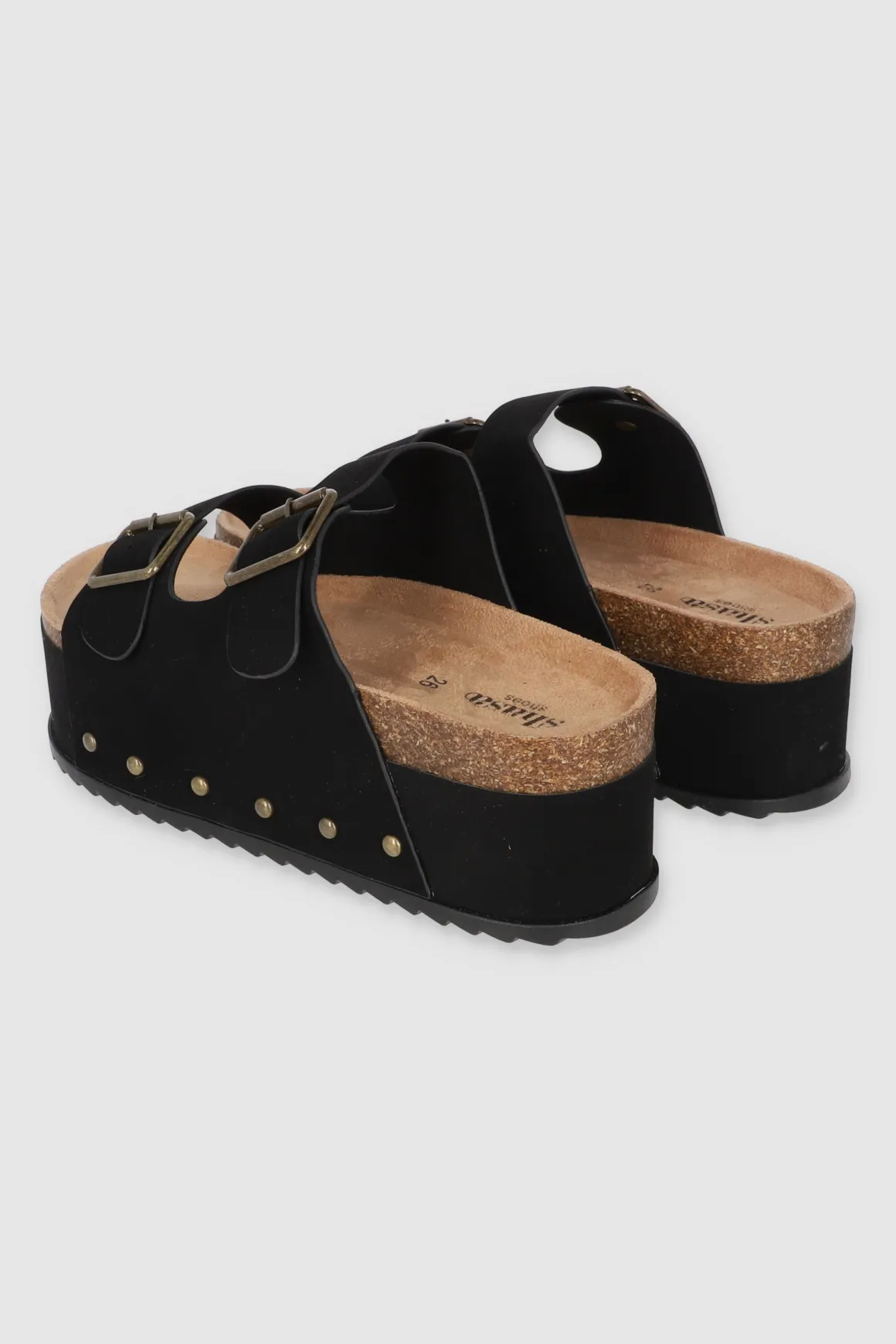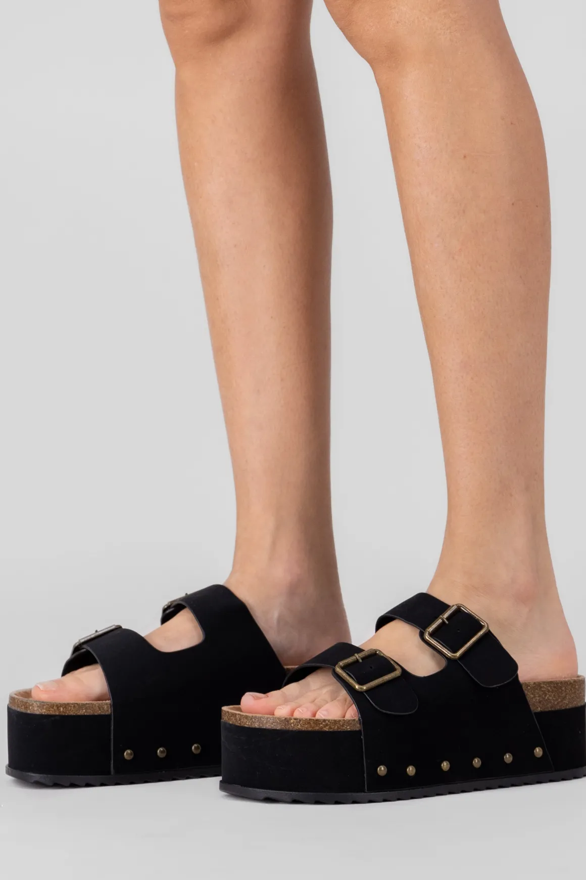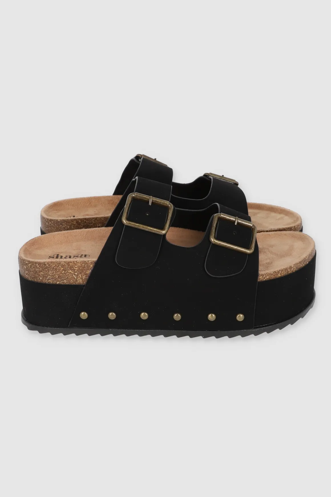 Estas sandalias de mega plataforma te harán destacar. Con suela de corcho y doble cinta superior con hebillas metálicas, son el toque audaz que tu outfit necesita. Las aplicaciones de studs le añaden un toque rockero que las hace únicas. ¡Ideales para looks atrevidos y modernos!