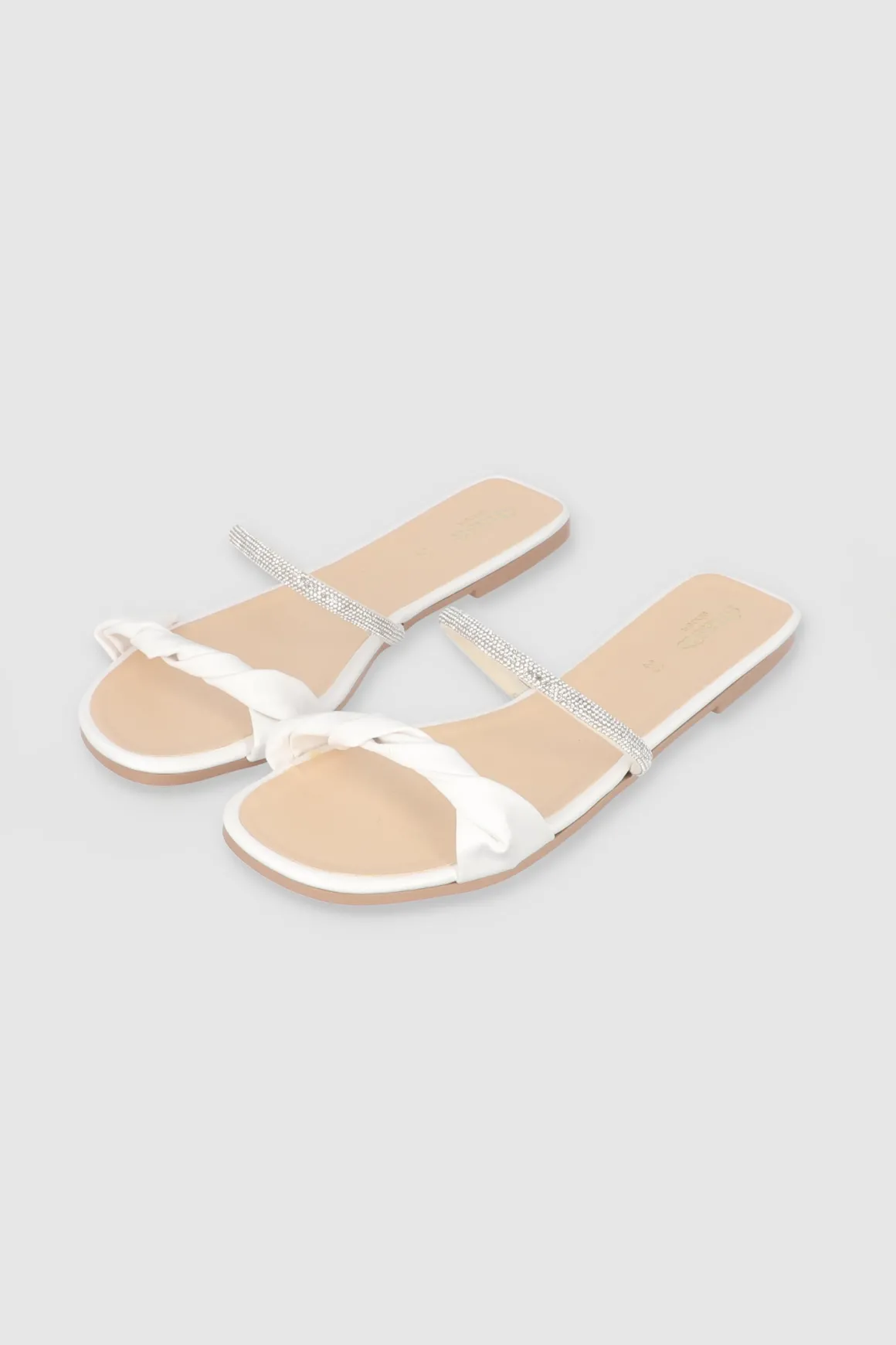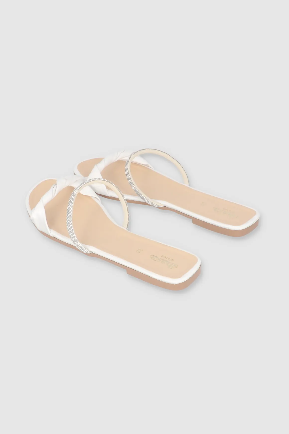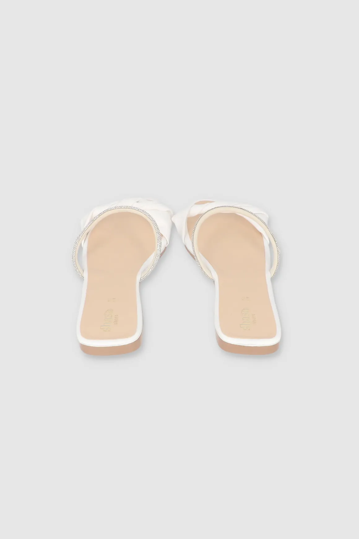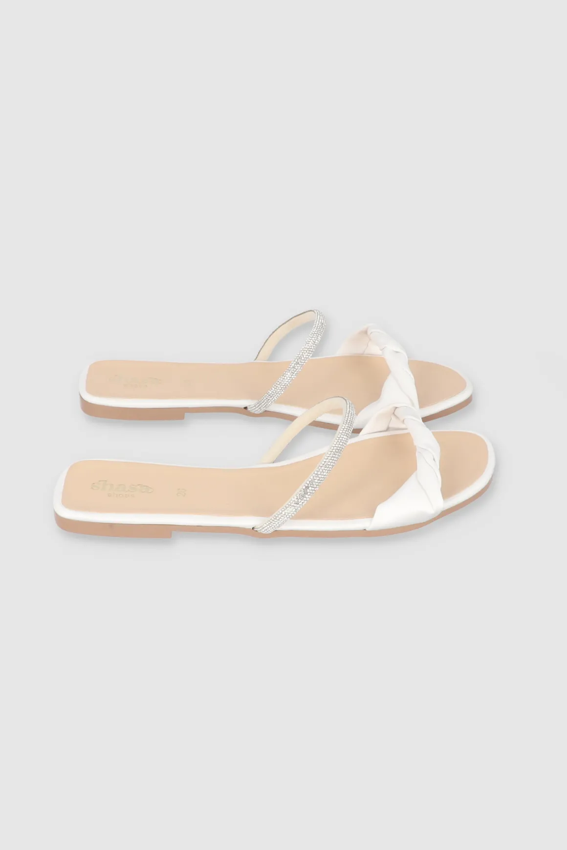 Estas sandalias planas son todo lo que necesitas para darle un toque moderno a tu outfit. Con una cinta superior con detalle de nudo y una tira delgada con aplicación de brillos, son ideales para cualquier ocasión. Perfectas para combinar con tus jeans favoritos o un vestido veraniego, estas sandalias son la opción perfecta para mantener tu look fresco y a la moda.