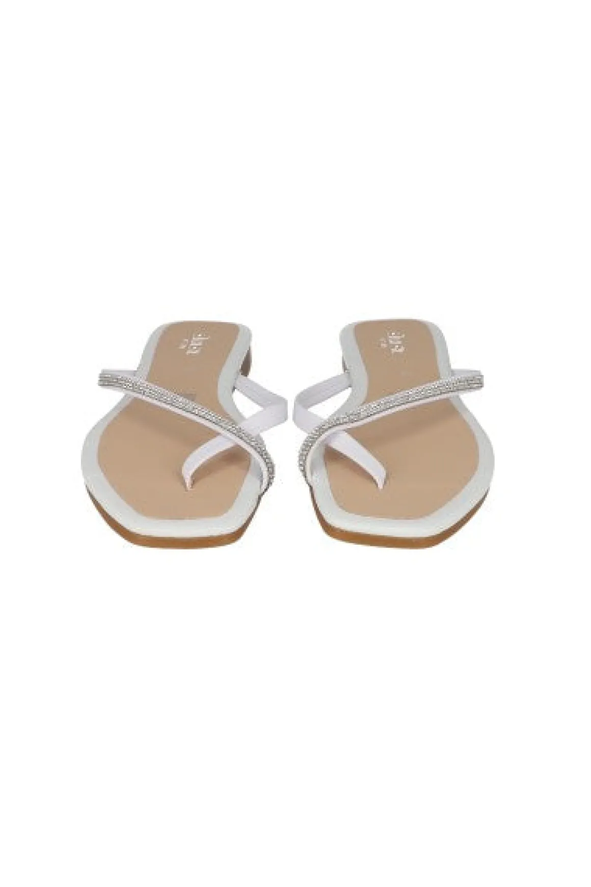 Sandalias pala con punta cuadrada en efecto metalizado. Tiras laterales cruzadas en anillo para dedo.