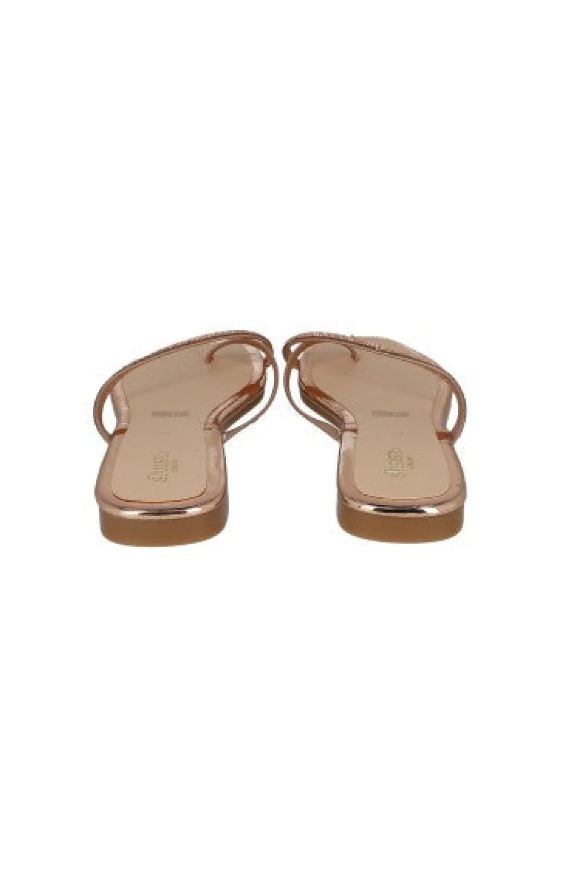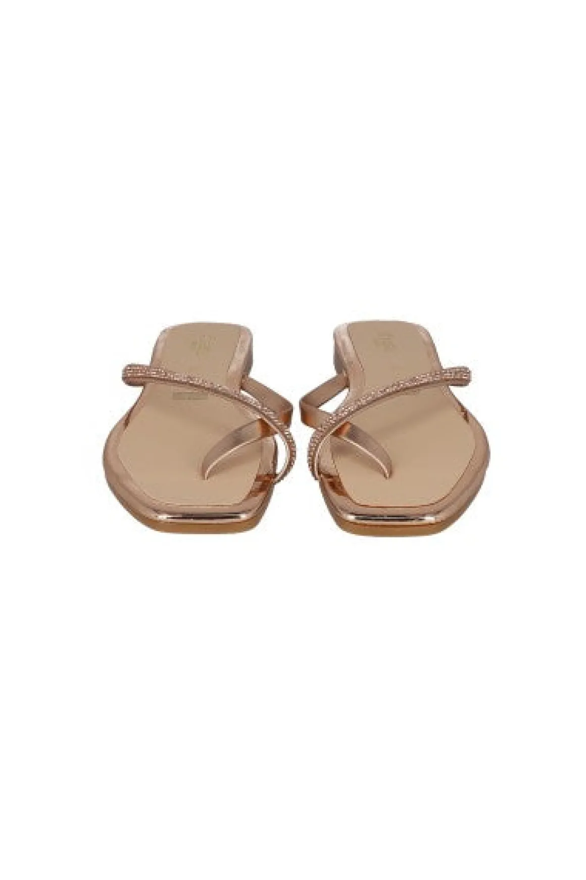 Sandalias pala con punta cuadrada en efecto metalizado. Tiras laterales cruzadas en anillo para dedo.
