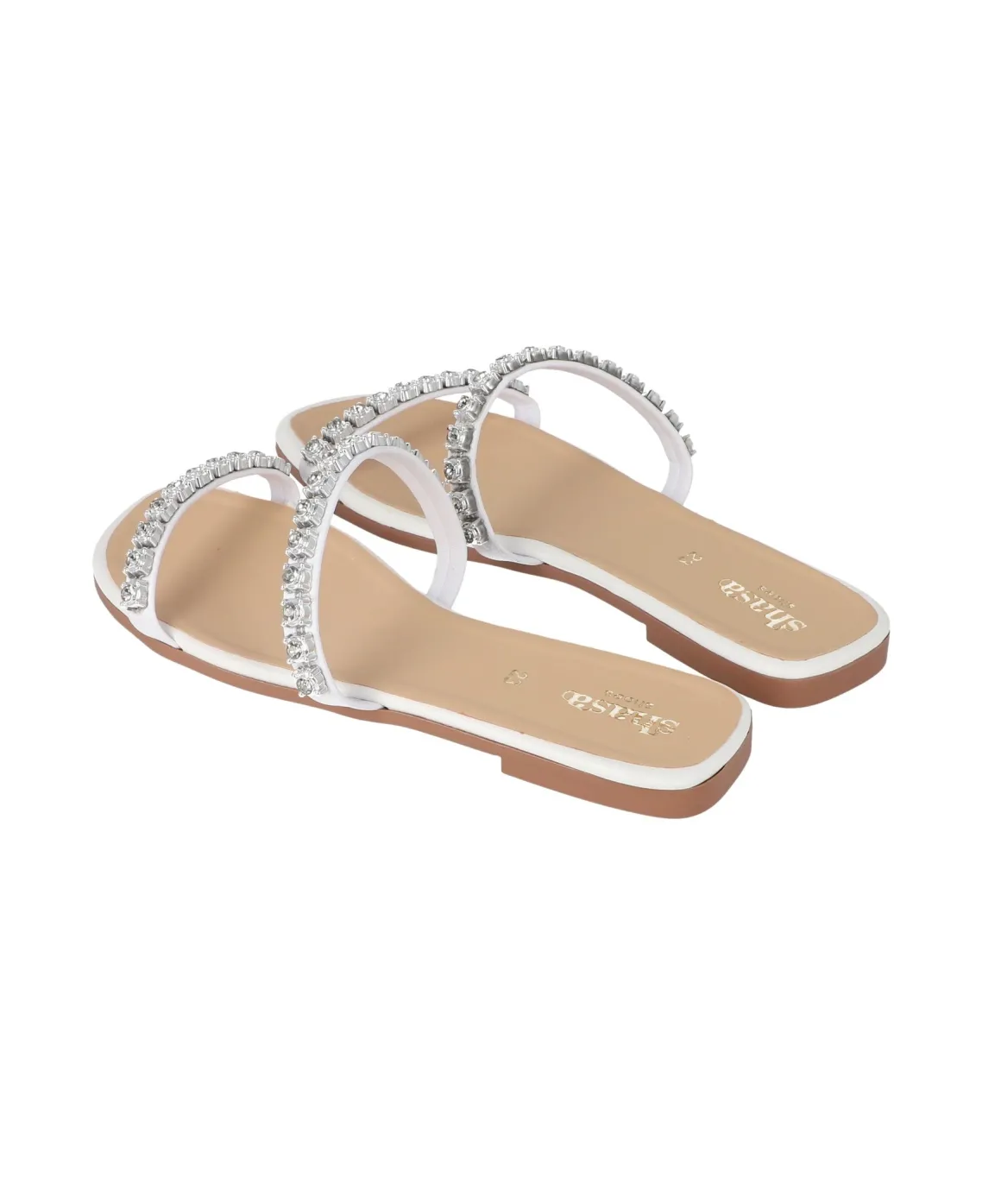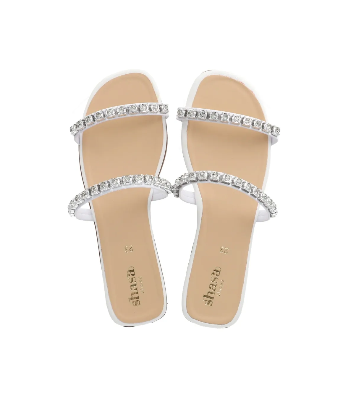 Sandalias pala con punta semi cuadrada. Doble tira frontal delgada con aplicación de piedras brillosas.