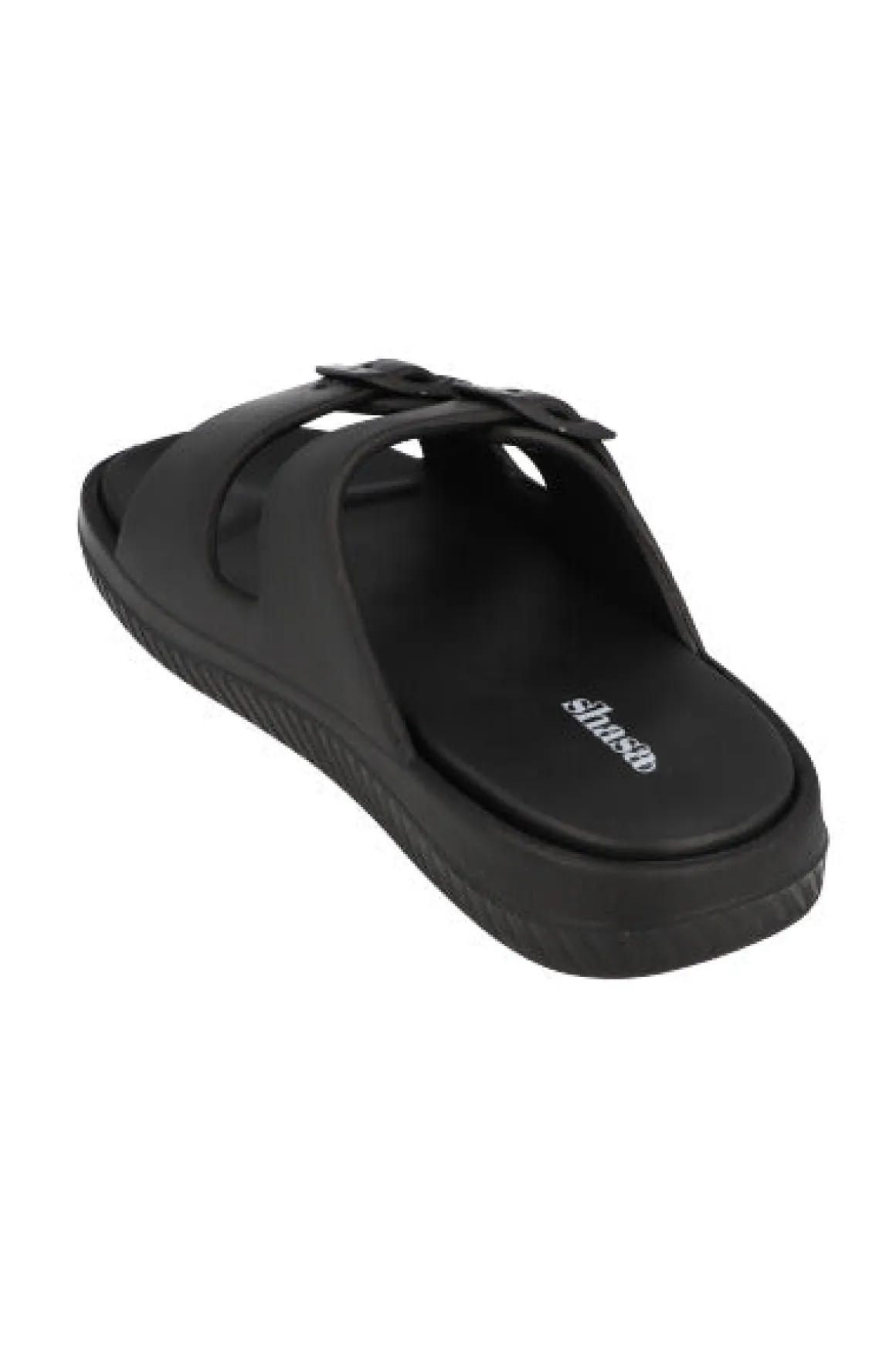 Sandalia slide de doble tira ancha con hebillas combinadas a tono. Suela antiderrapante.