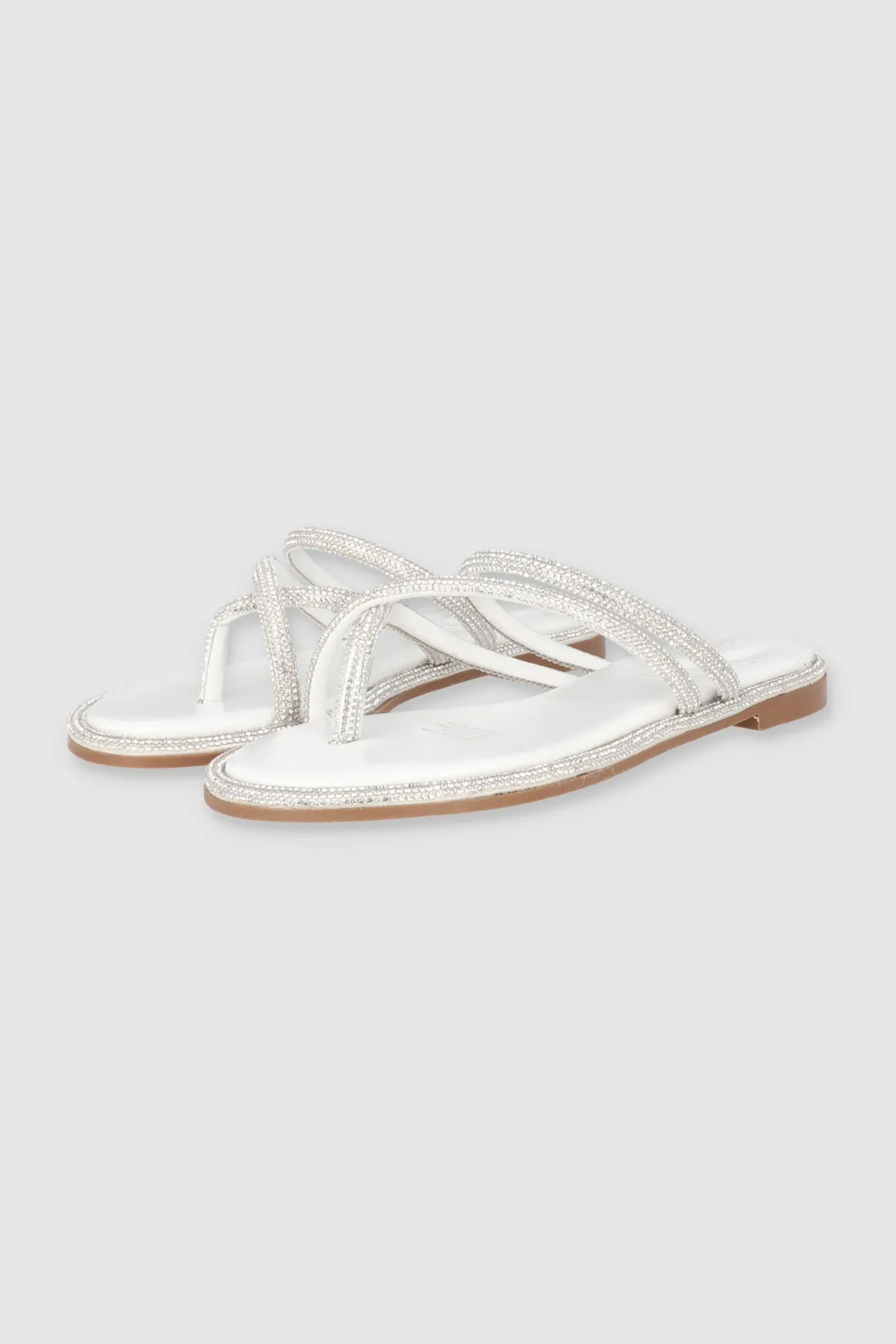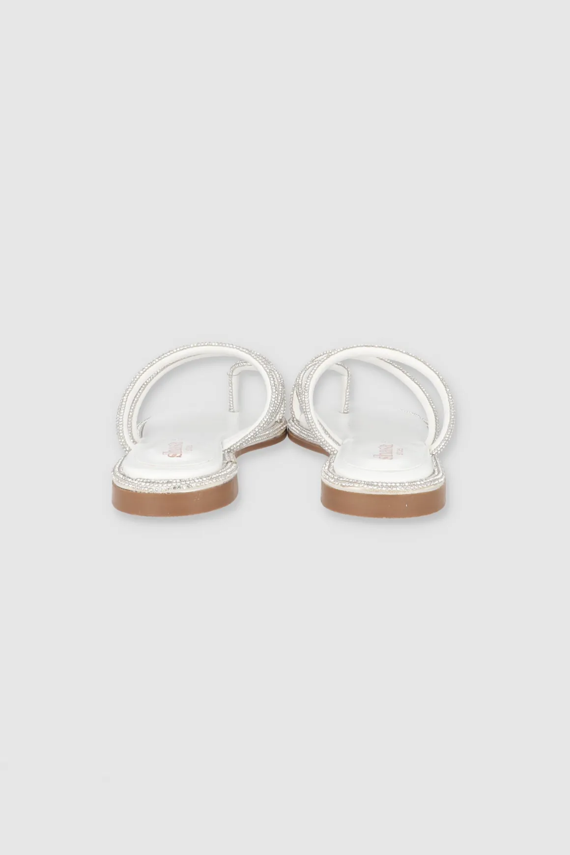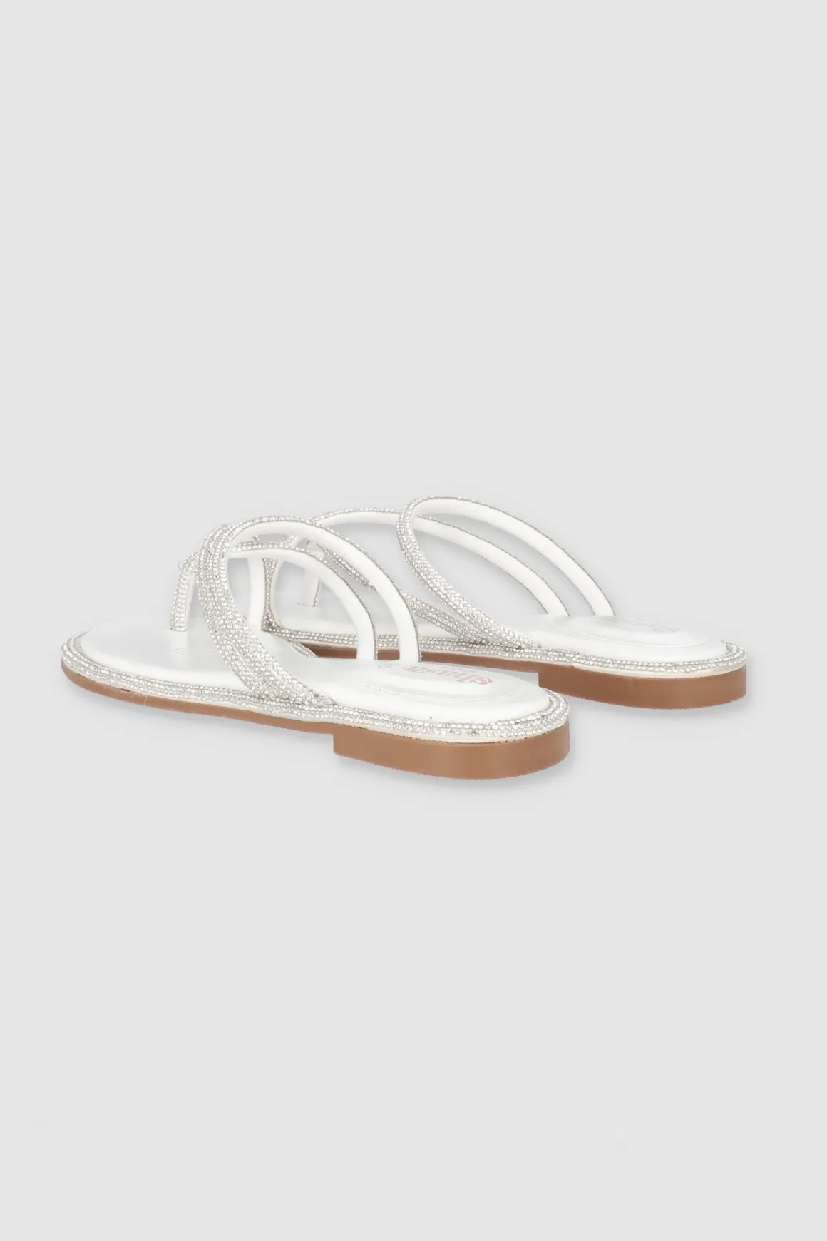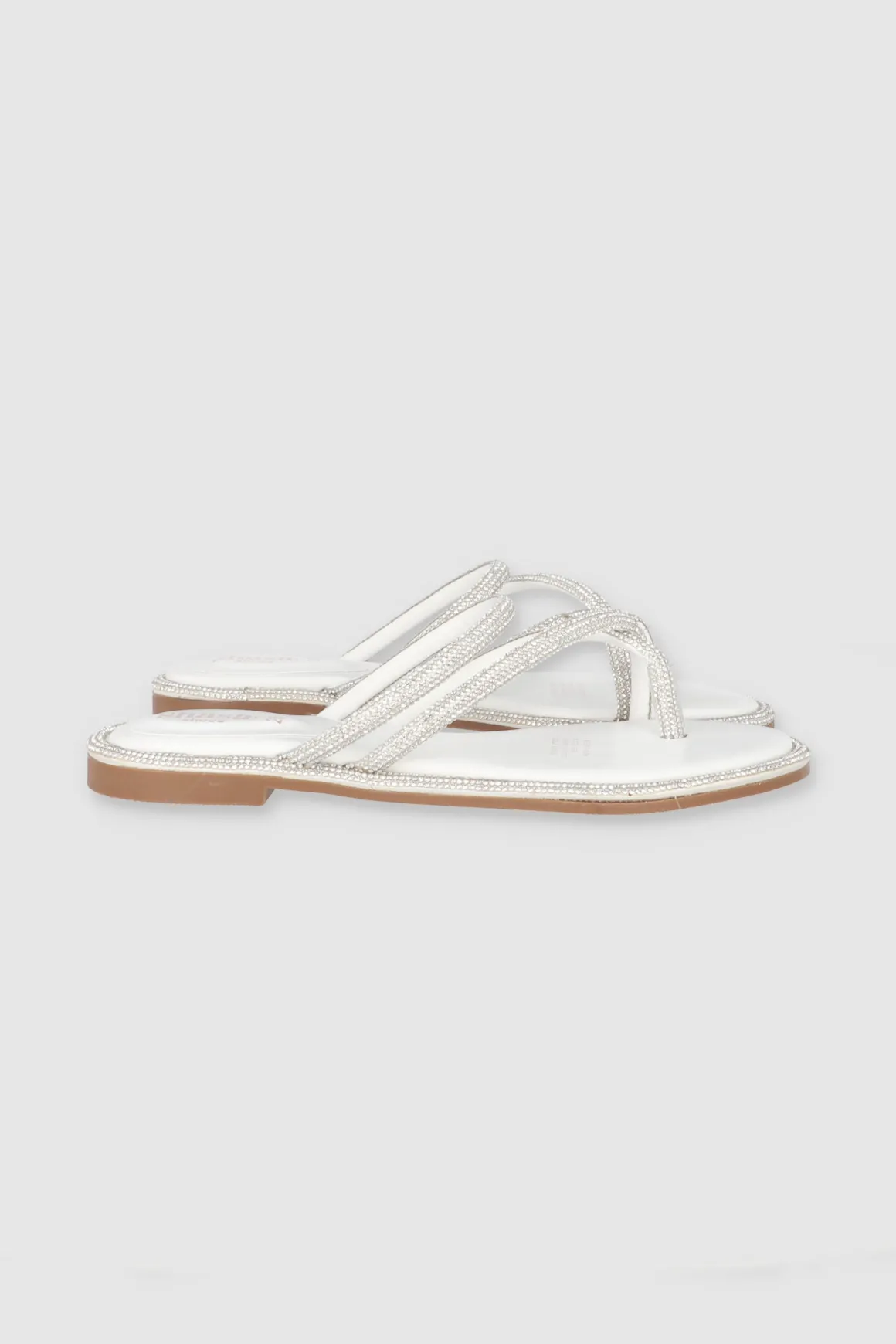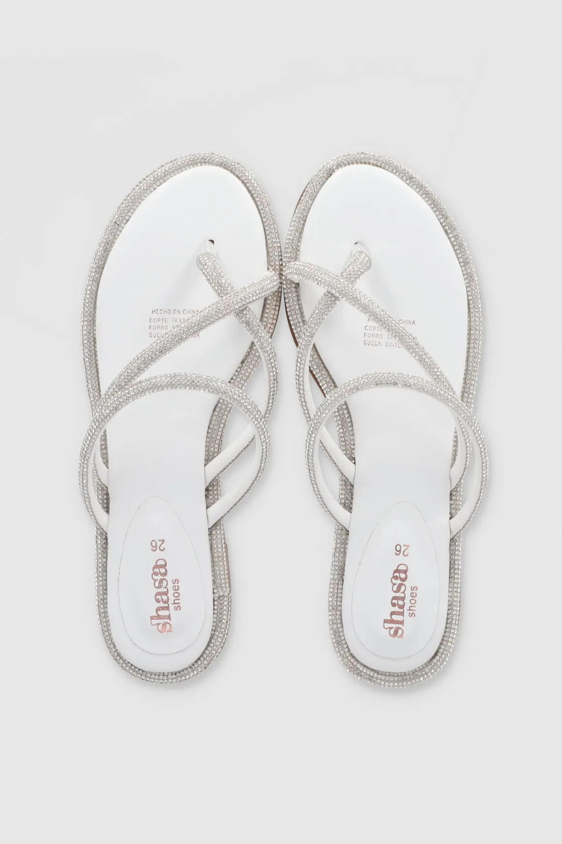 Descubre nuestras sandalias planas ideales para cualquier ocasión. Con cintas delgadas superiores cruzadas, estas sandalias ofrecen un diseño moderno y versátil. La decoración con aplicaciones de brillos en las cintas y los bordes con brillos le dan un toque glam que te encantará. Perfectas para combinar con tus outfits favoritos de verano, estas sandalias serán tu elección favorita para destacar.