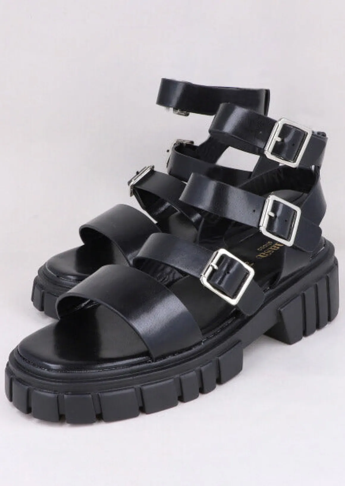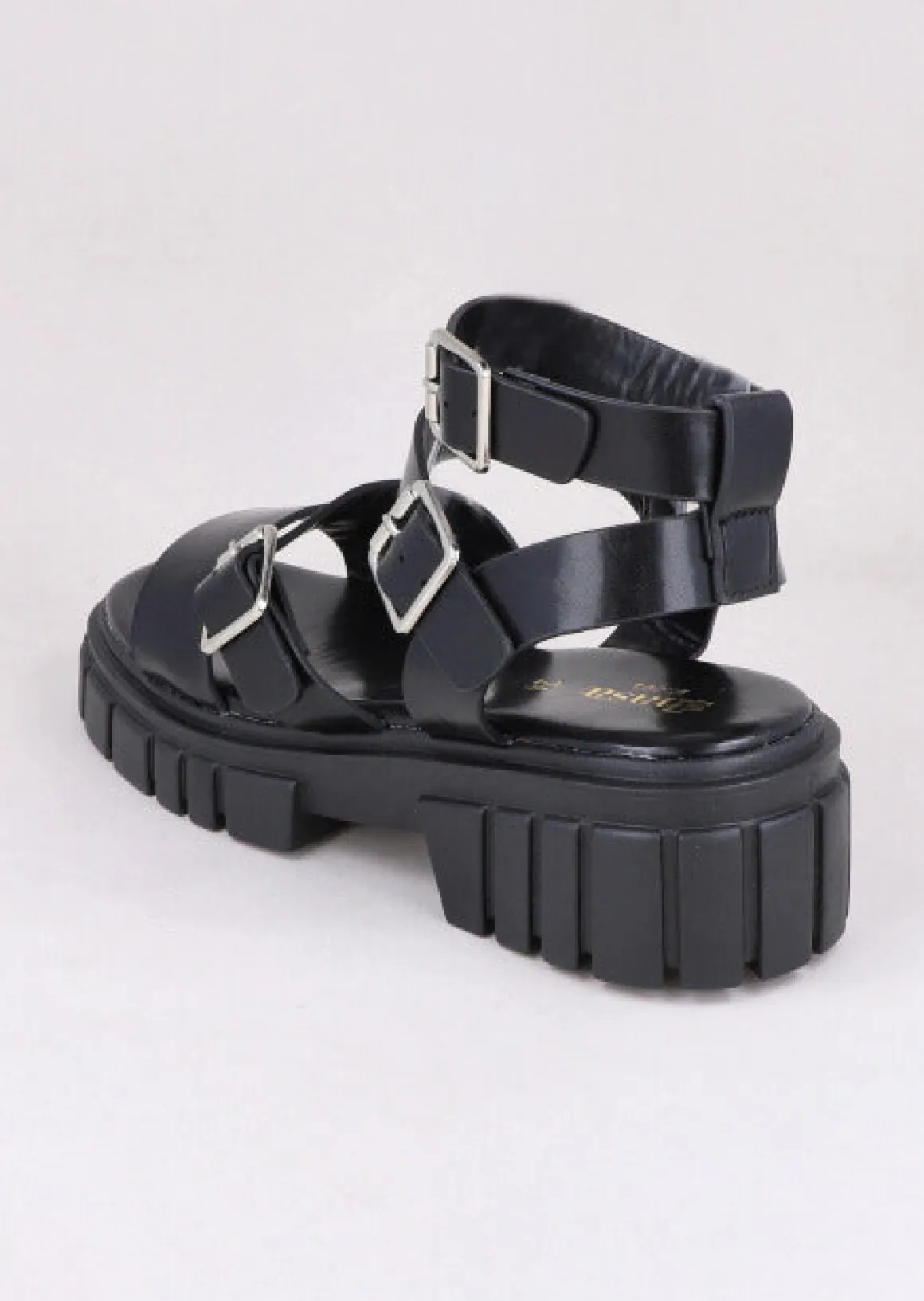 Sandalías chunky con tiras triples en la parte superior y correa de ajuste para tobillo con hebilla.