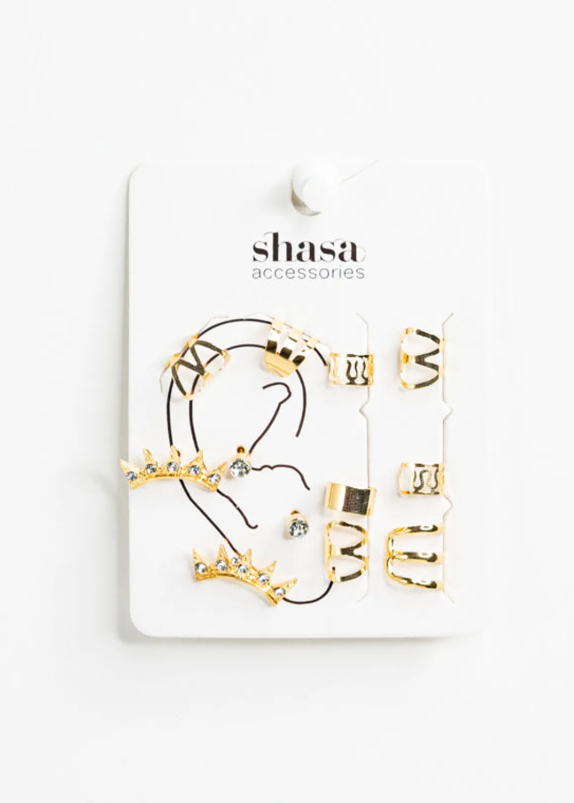 Juego de 12 aretes. Earcuffs de clip con aberturas y aretes studs en forma de corona con aplicaciones de strass.