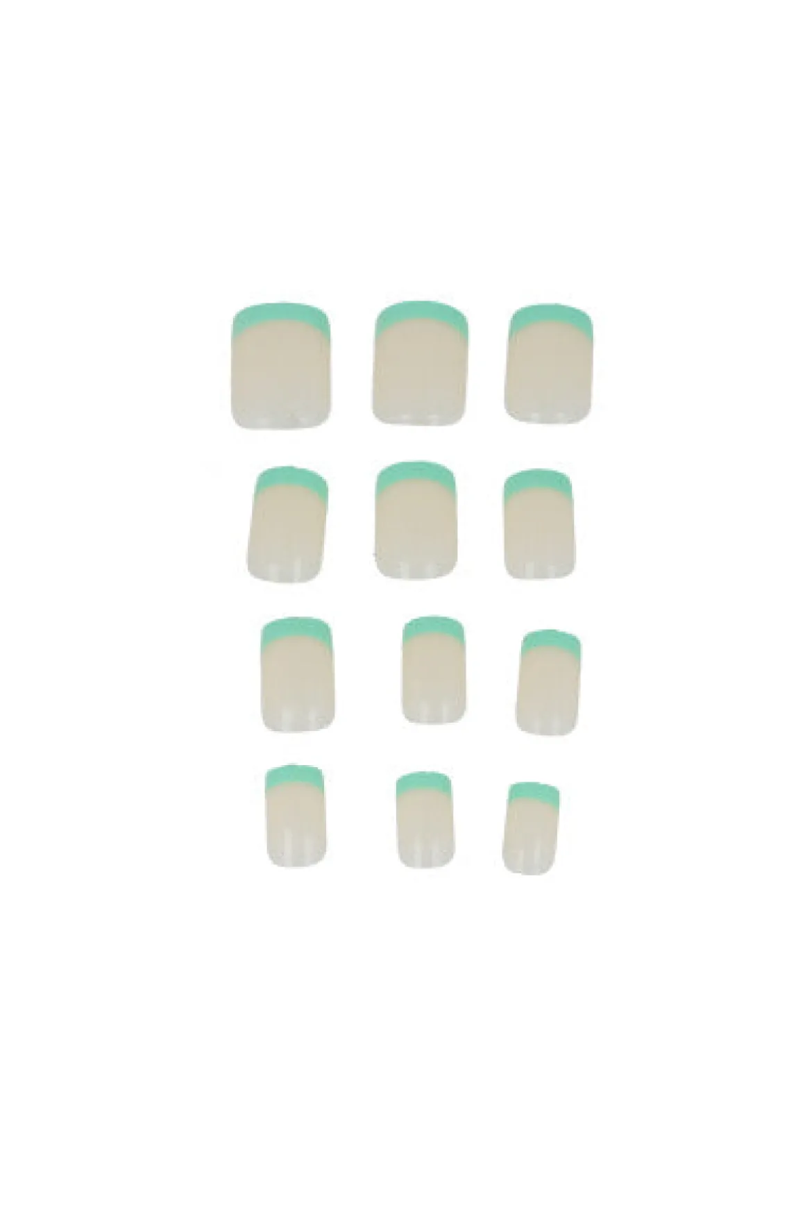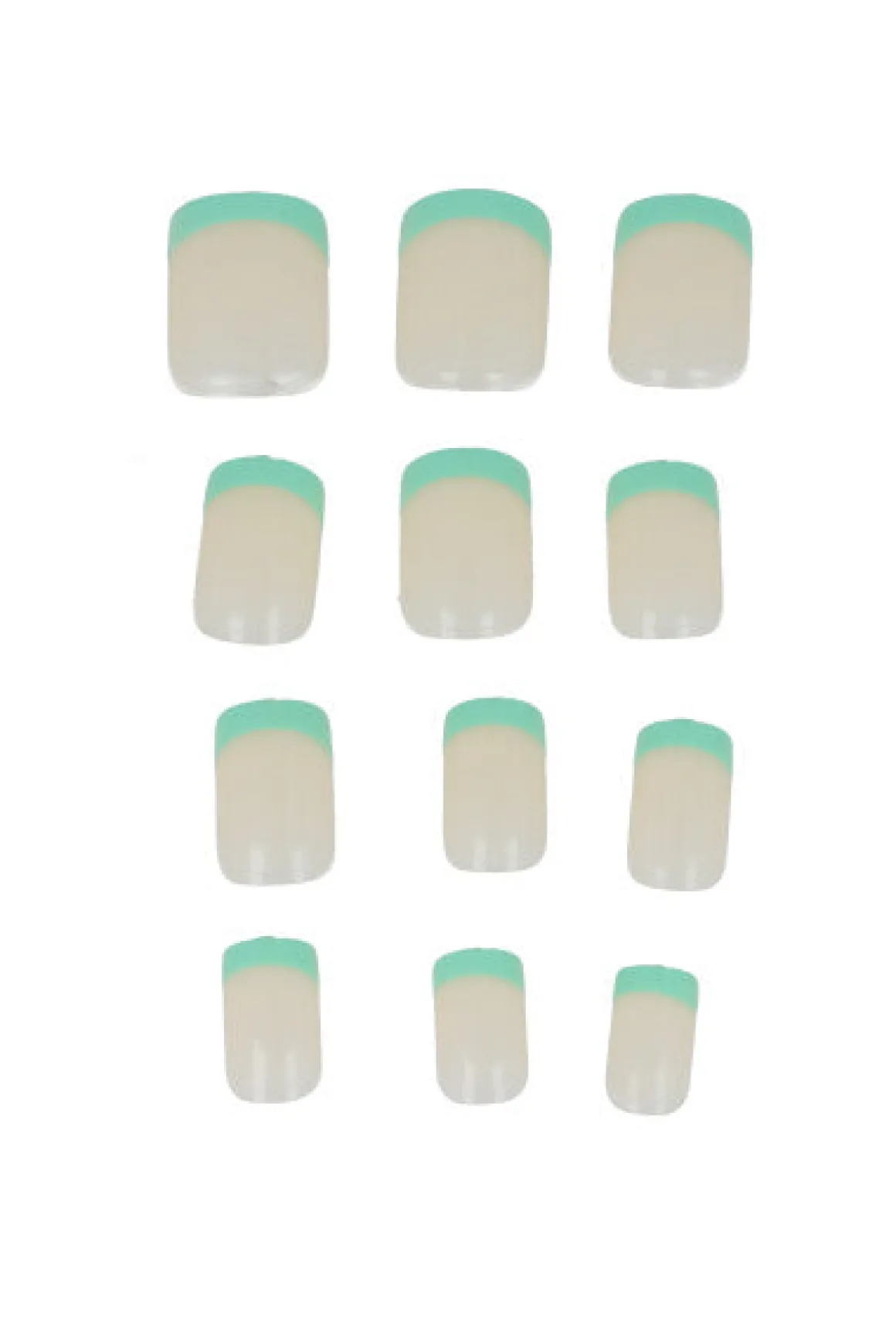 Set 12 piezas de uñas postizas autoadhesivas. Punta cuadrada con efecto brillo y diseño francés.