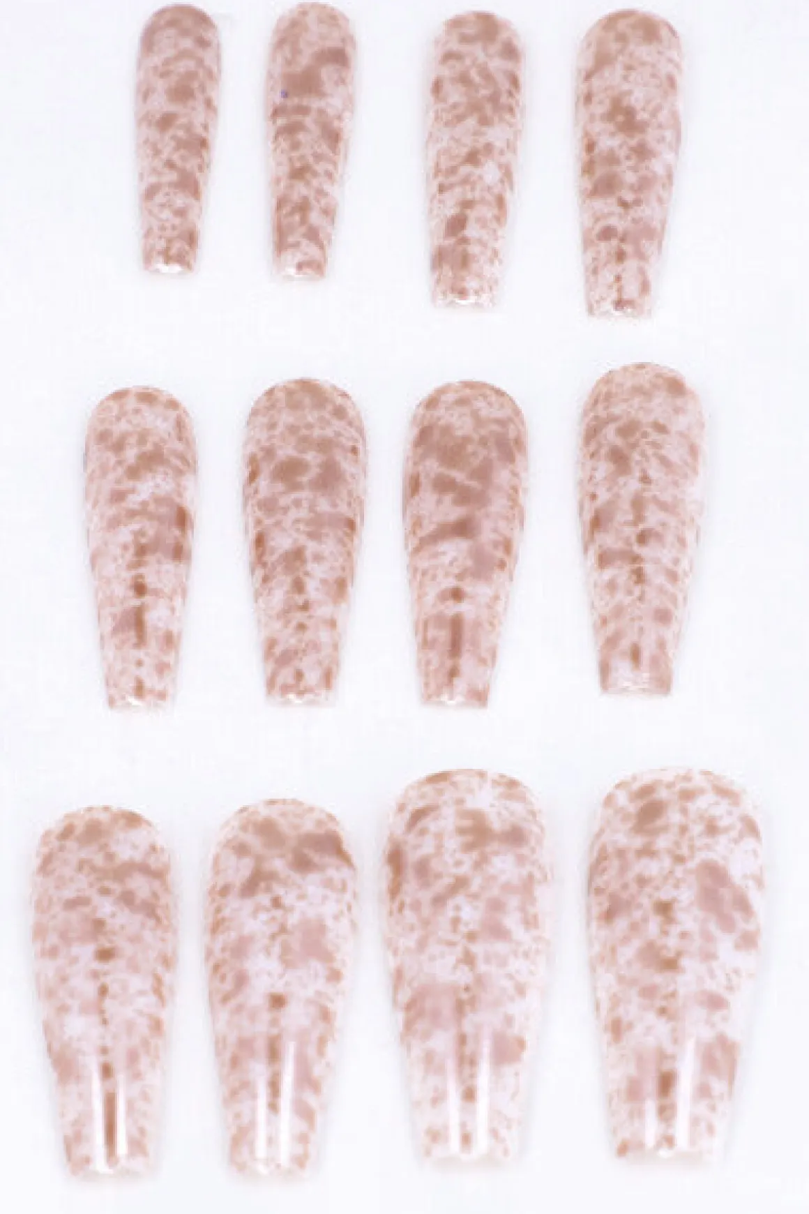 Set de 12 uñas postizas largas. Diseño de manchas tie dye.