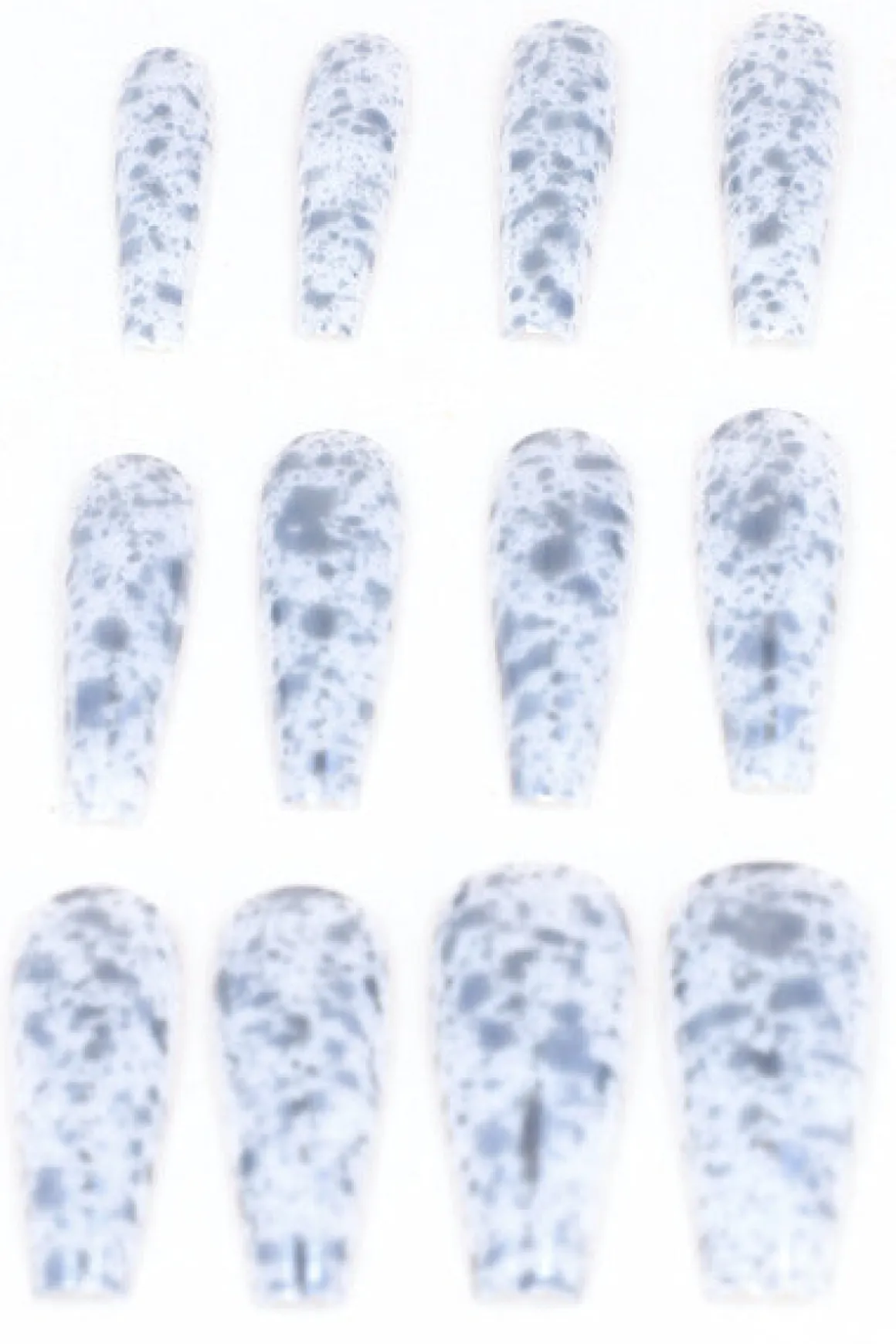 Set de 12 uñas postizas largas. Diseño de manchas tie dye.