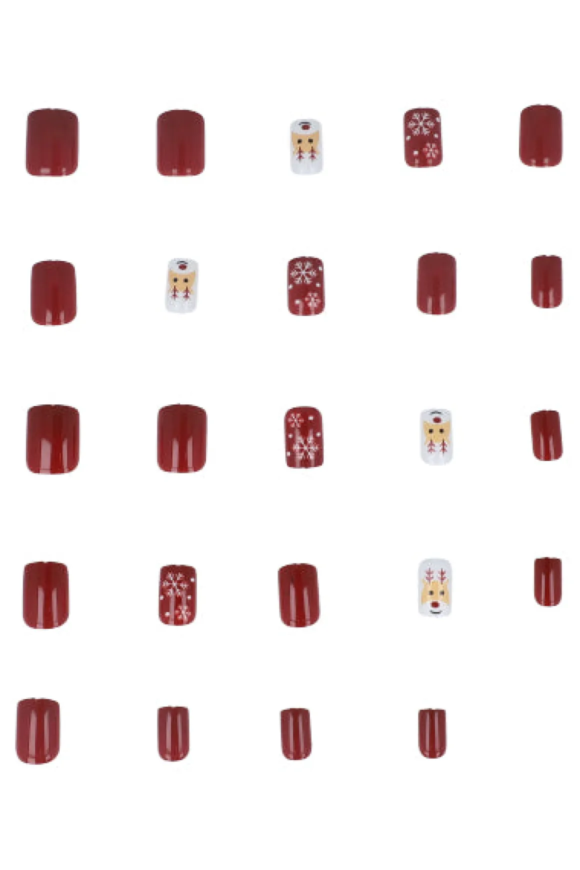 Set de 12 uñas postizas autoadhesivas forma cuadrada. Diseño navideño con reno y copo de nieve.