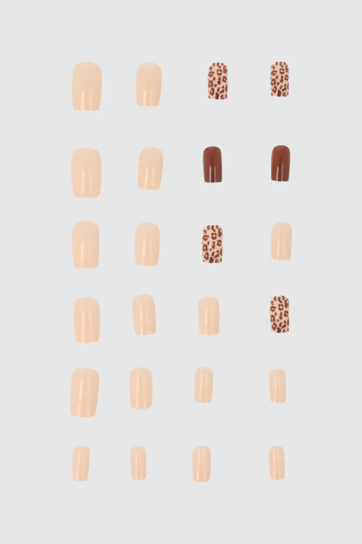 Este set de uñas adhesivas con punta cuadrada y diseños de animal print te dará un look audaz y salvaje. Aplícalas fácilmente para un estilo instantáneo que dura días.