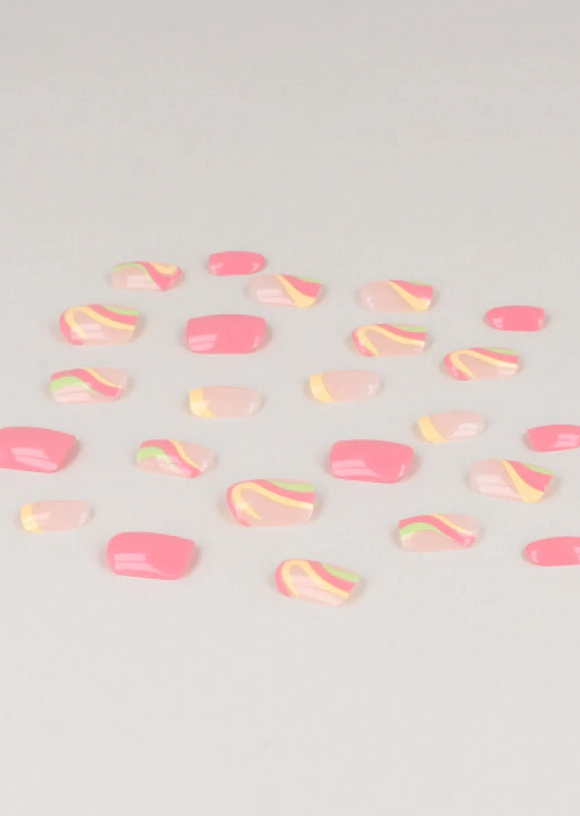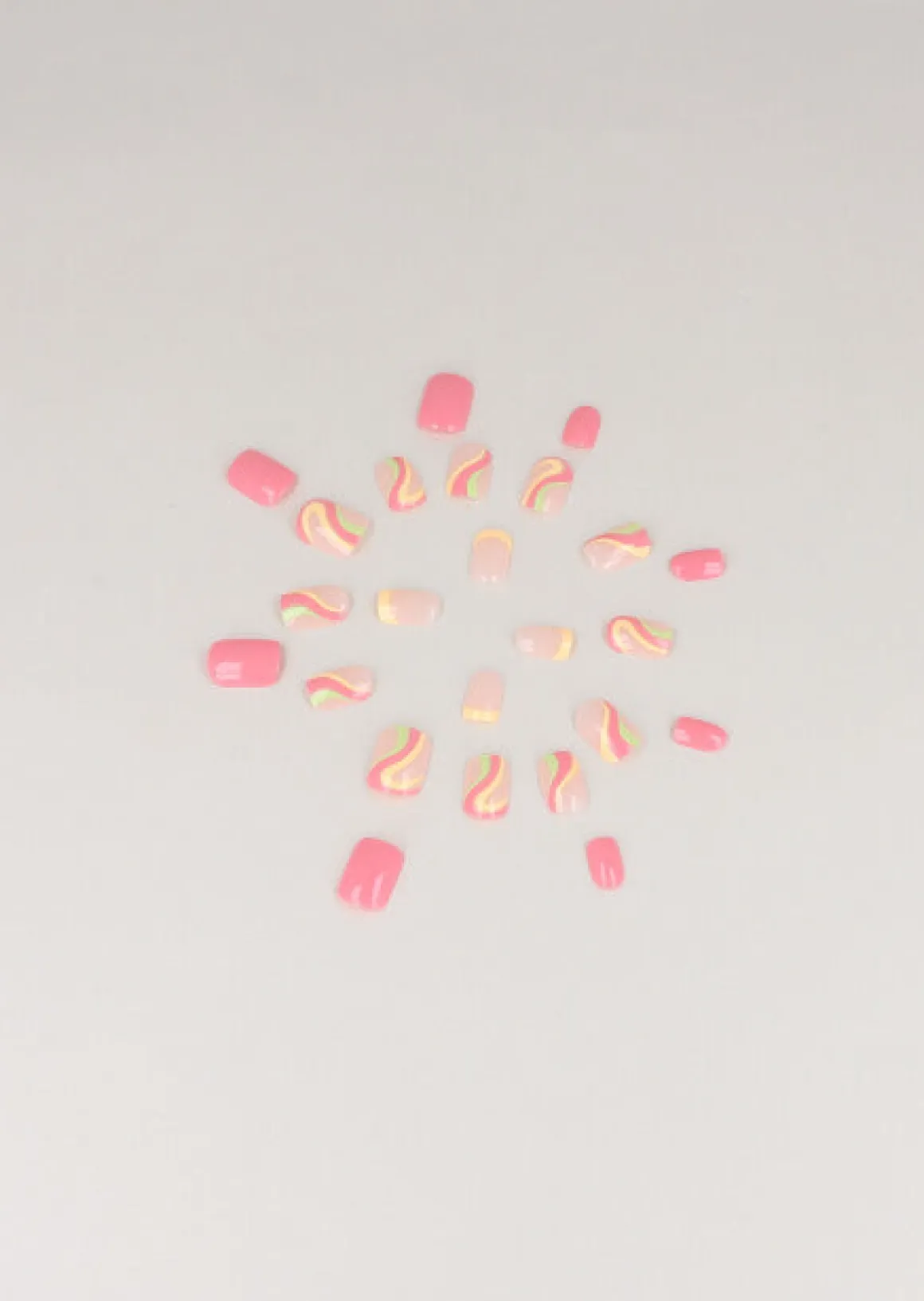 Set de 24 uñas autoadhesivas de punta cuadrada en diseño de ondas en efecto neón pastel.