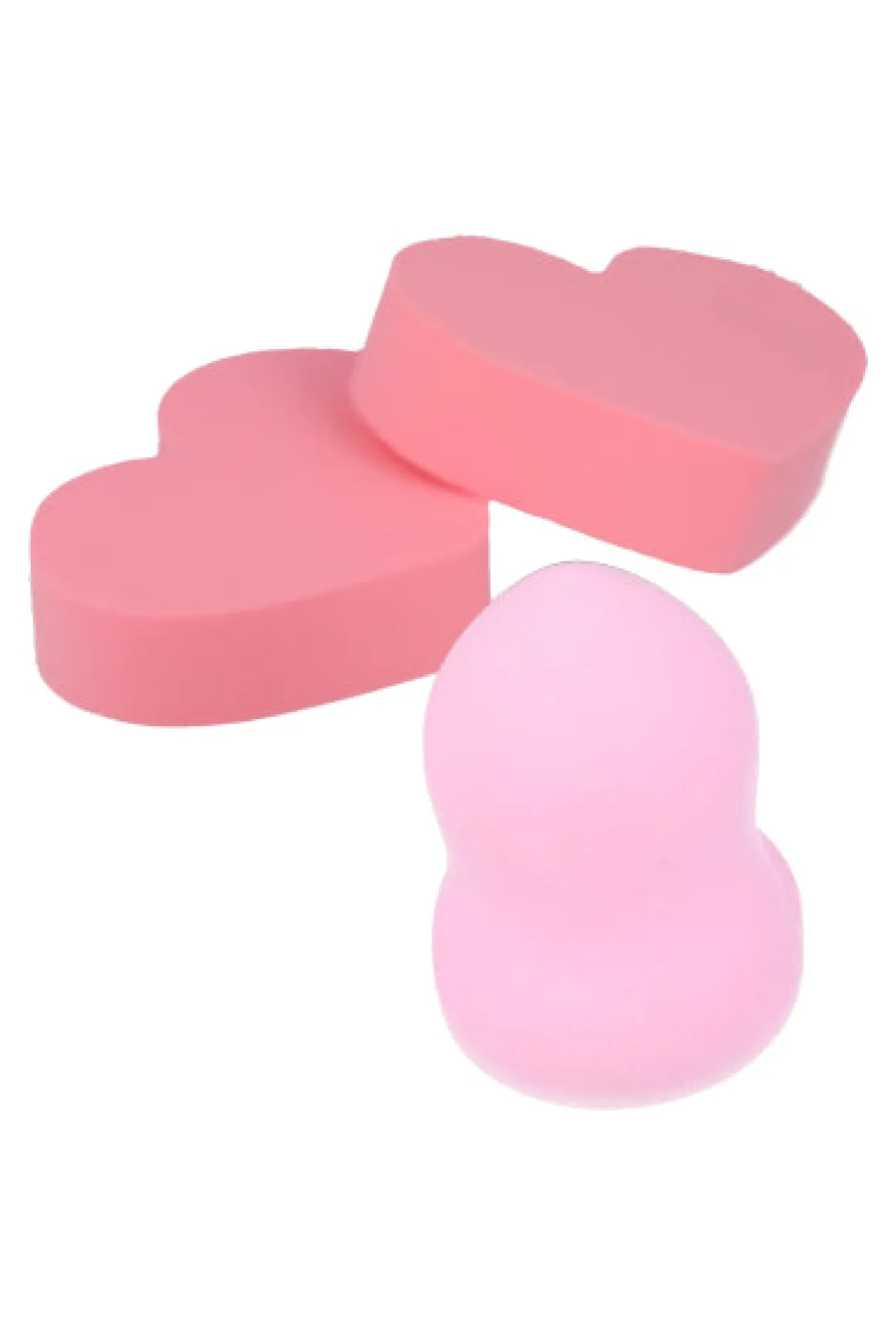 Set de 3 esponjas para maquillaje. Una esponja blender y dos esponjas con diseño de corazón.