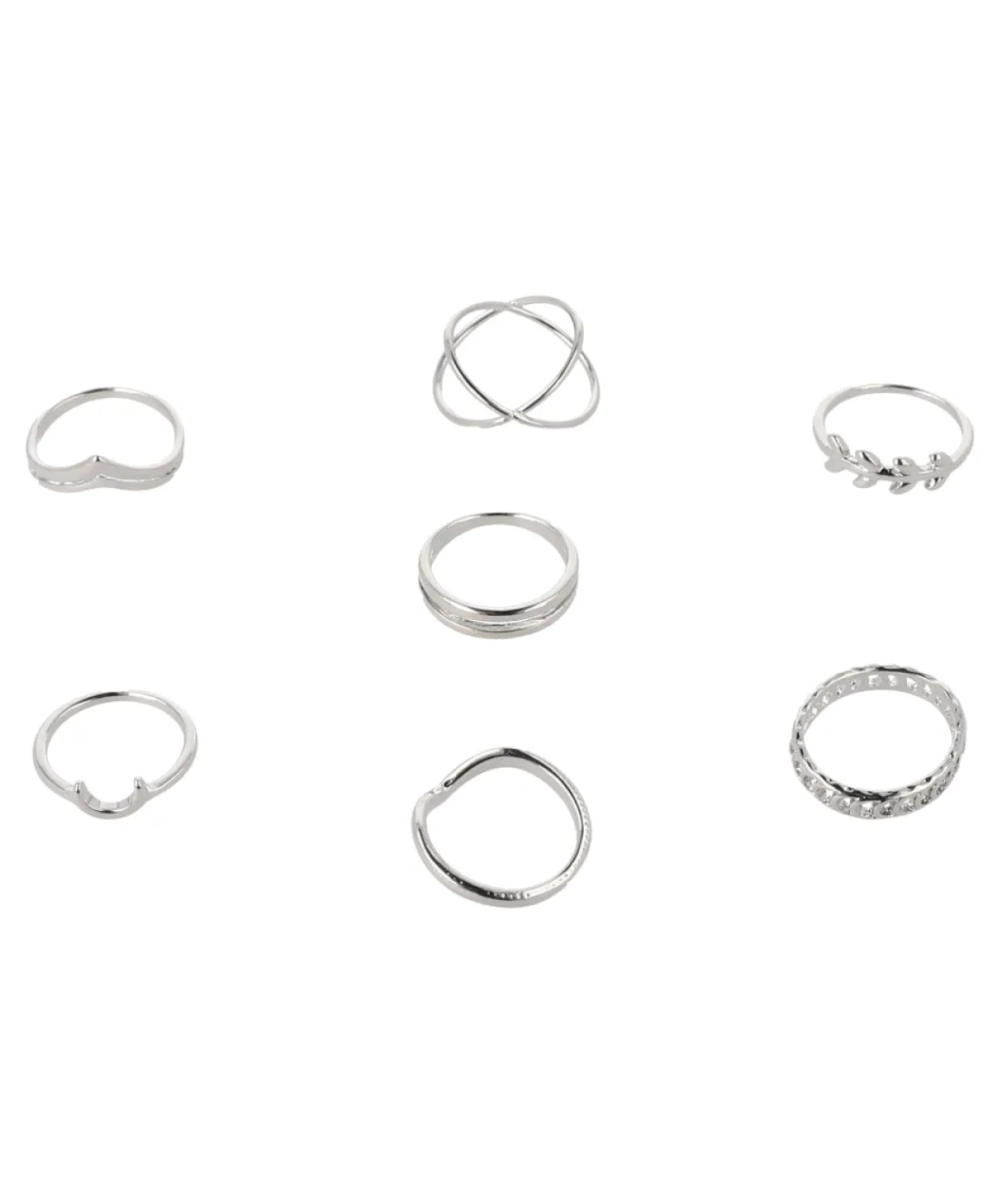 Conjunto de 7 anillos minimalistas con relieves, aberturas, doble aro, figuras de luna y hojas.