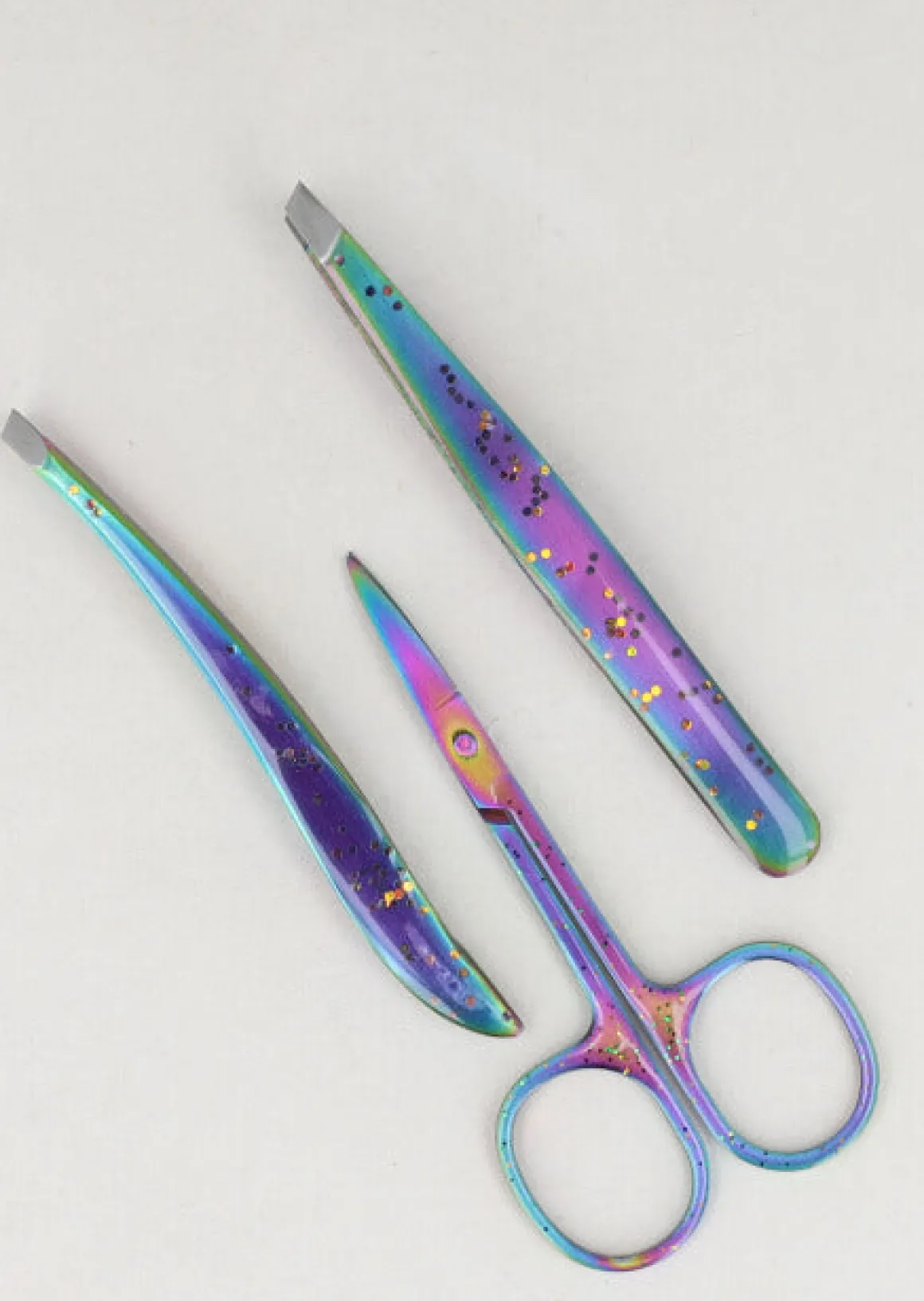 Set de 2 depiladores de acero inoxidable con diseño curvo. Tijera mini. Tornasol.