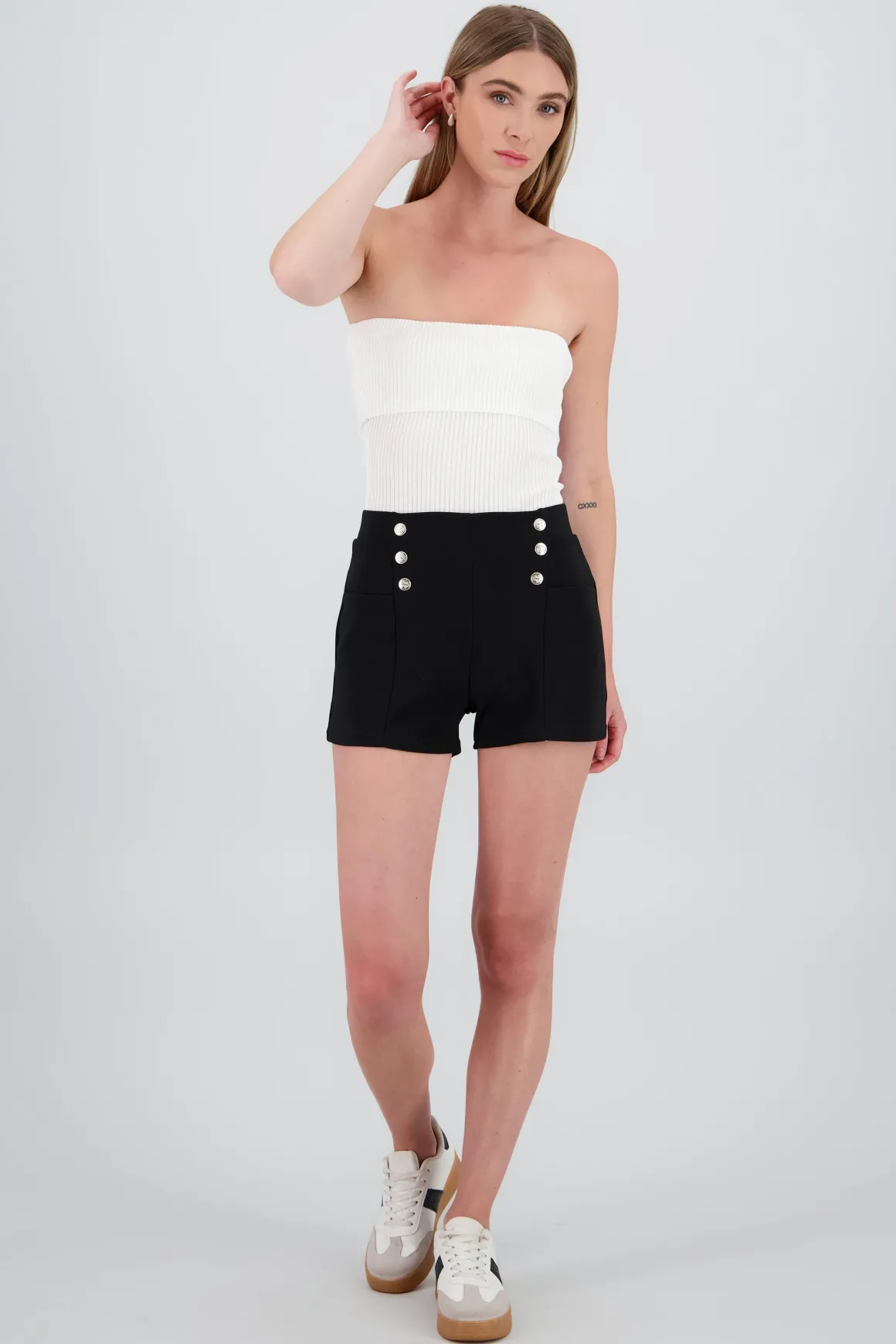Este short es tu nueva opción favorita para los días más cálidos. Con pinzas que le dan estructura y botones lisos que añaden un toque único, es perfecto para cualquier plan.