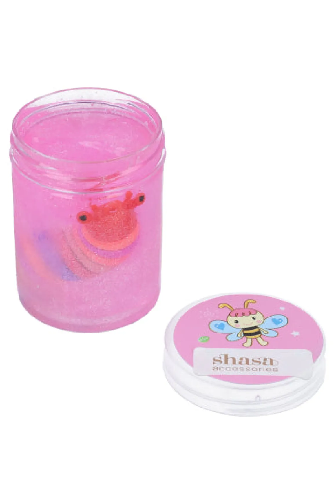 Slime transparente con glitter. Con oruga multicolor de goma. En recipiente transparente con tapa.