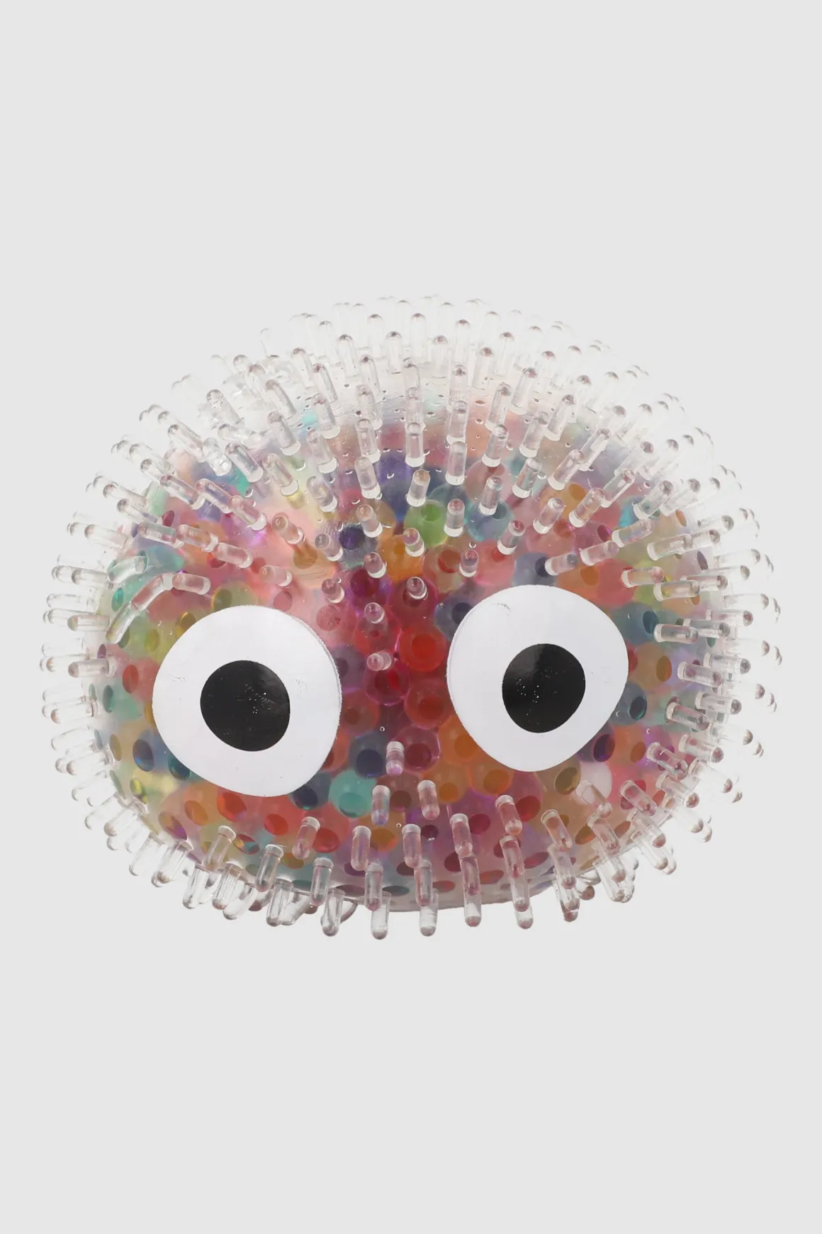 Juguete squishy transparente en forma de pelota grande con ojos, textura de pelos y relleno de tapioca.