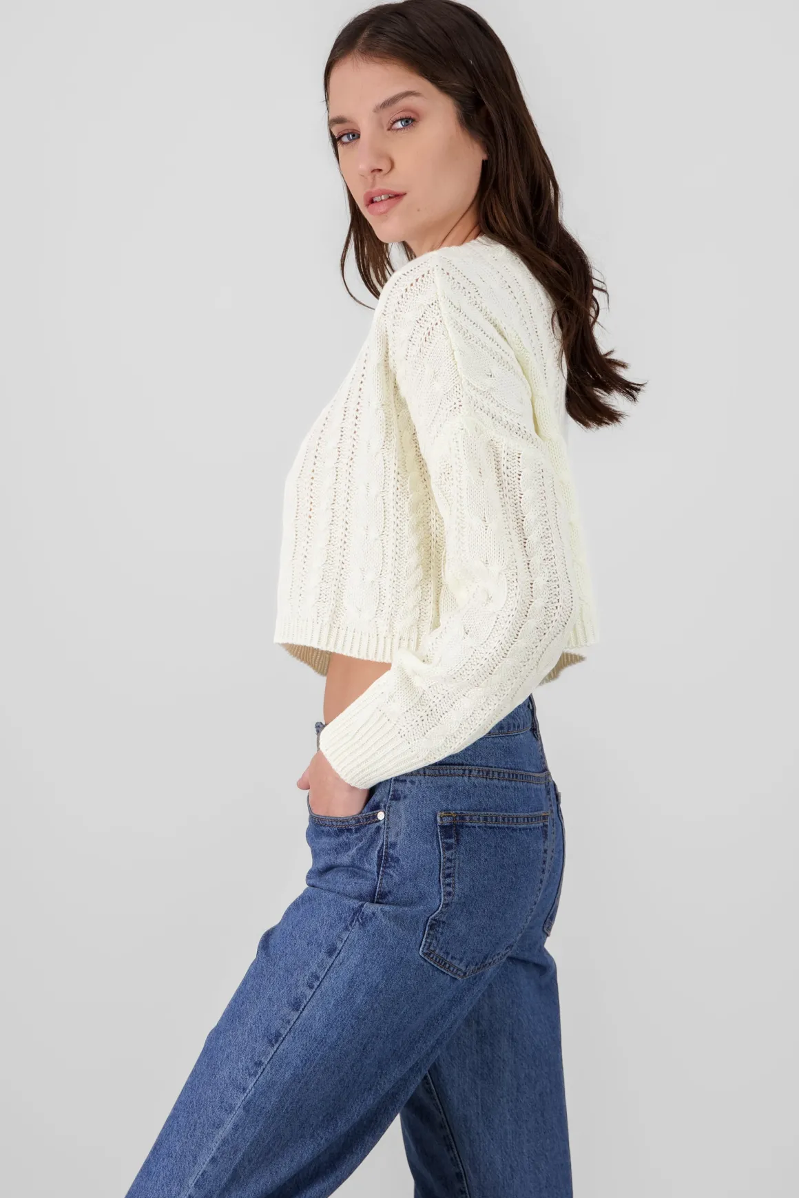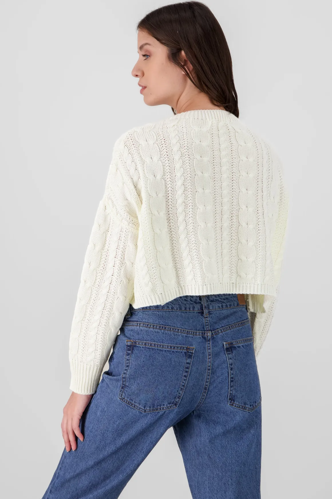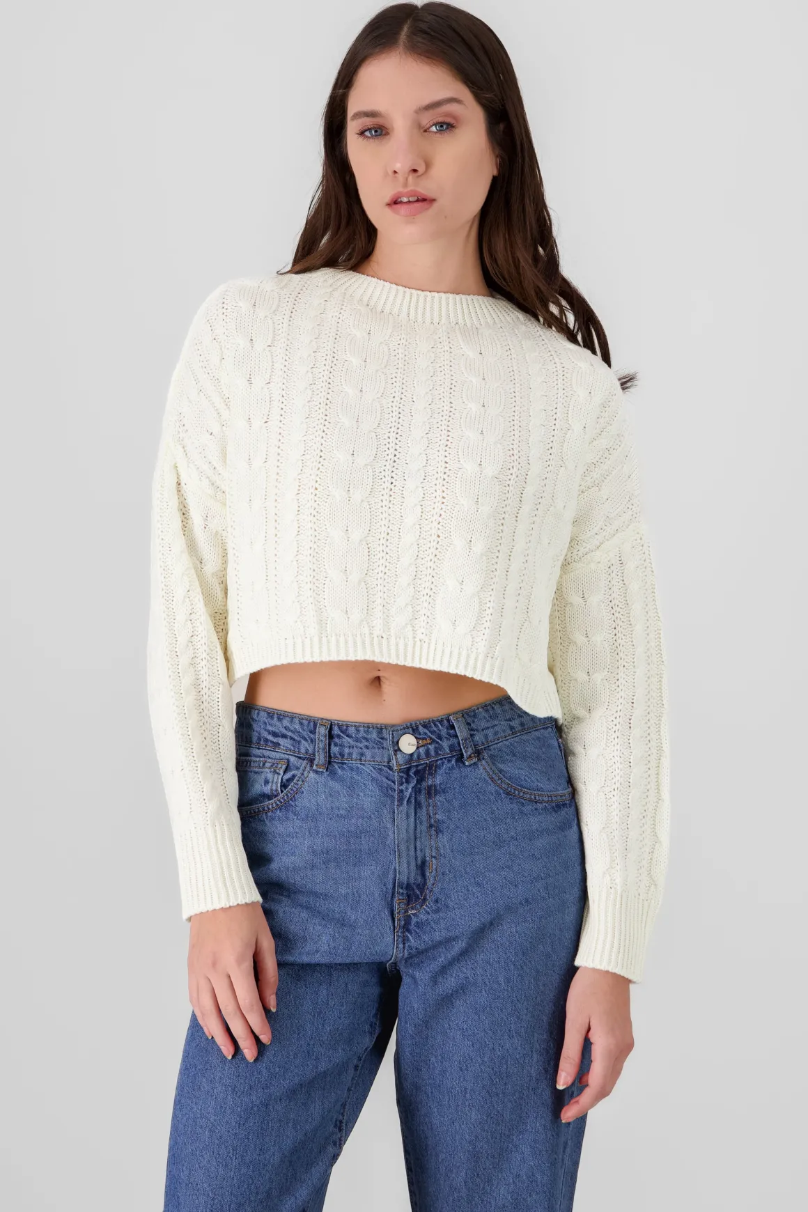 El suéter corto tejido trenzado es la elección perfecta para aquellos que buscan combinar estilo y comodidad. Presenta un cuello redondo que brinda una apariencia moderna y femenina. Los bordes acanalados añaden un toque clásico, mientras que el diseño de trenza le otorga un look único y cómodo.