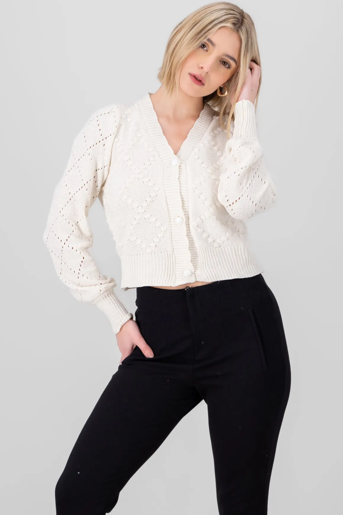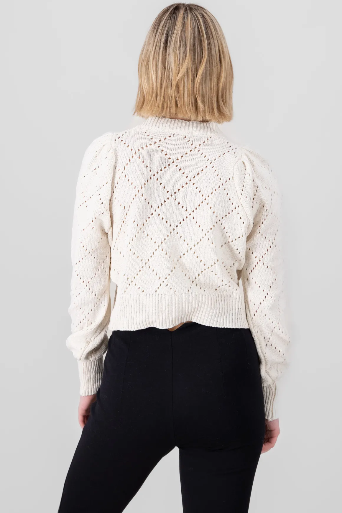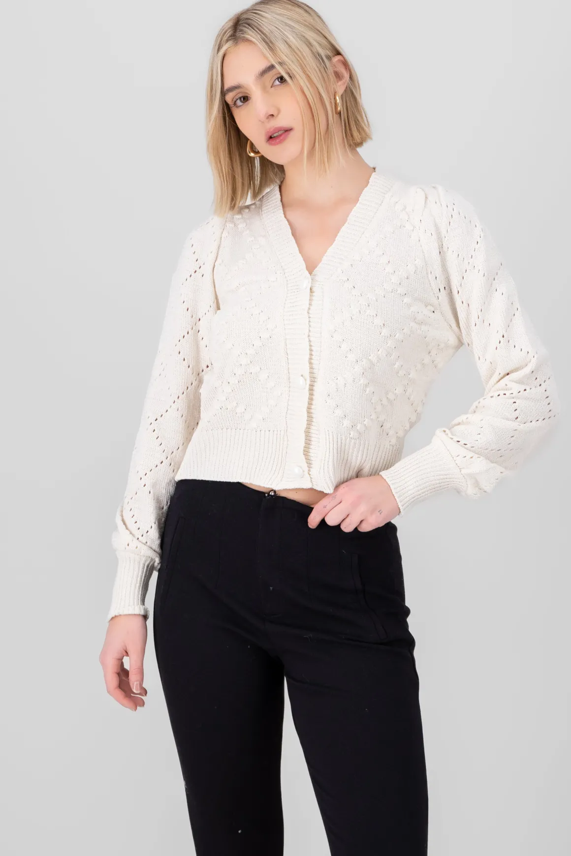 Suéter tipo cardigan con tejido de rombos y detalles de relieve: Este suéter tipo cardigan es perfecto para un look acogedor con un toque de estilo.