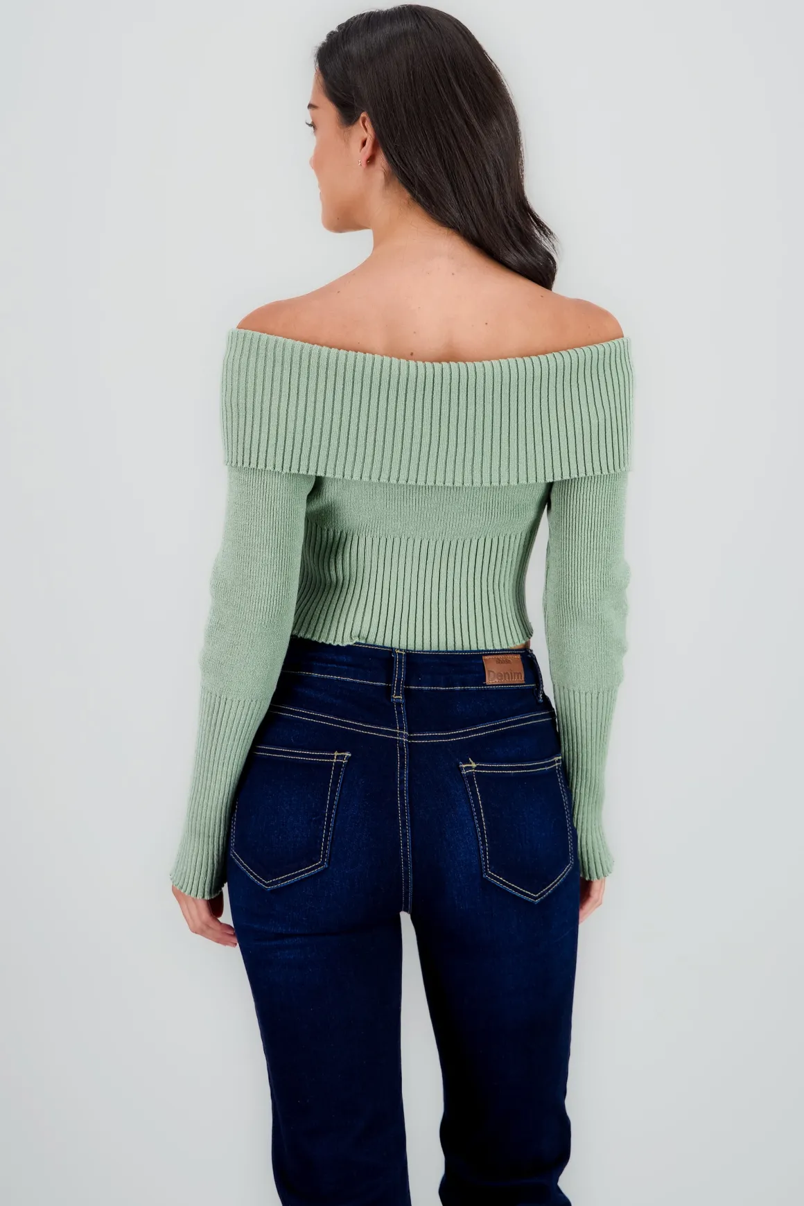 Este suéter off shoulder combina estilo y modernidad con un toque de estilo único. Diseñado para ser llevado con los hombros descubiertos, cuenta con un cierre metálico frontal que añade un detalle distintivo y chic.