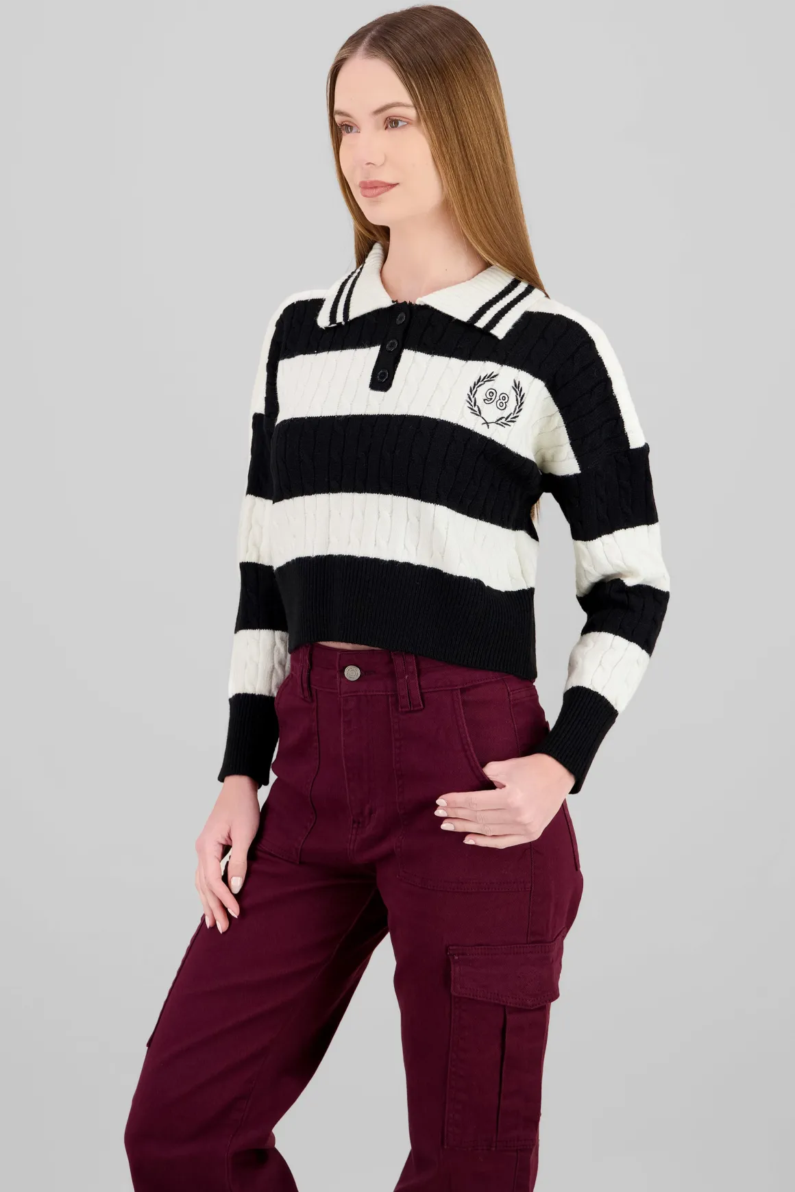 - Cuello polo que aporta un aire relajado y chic.