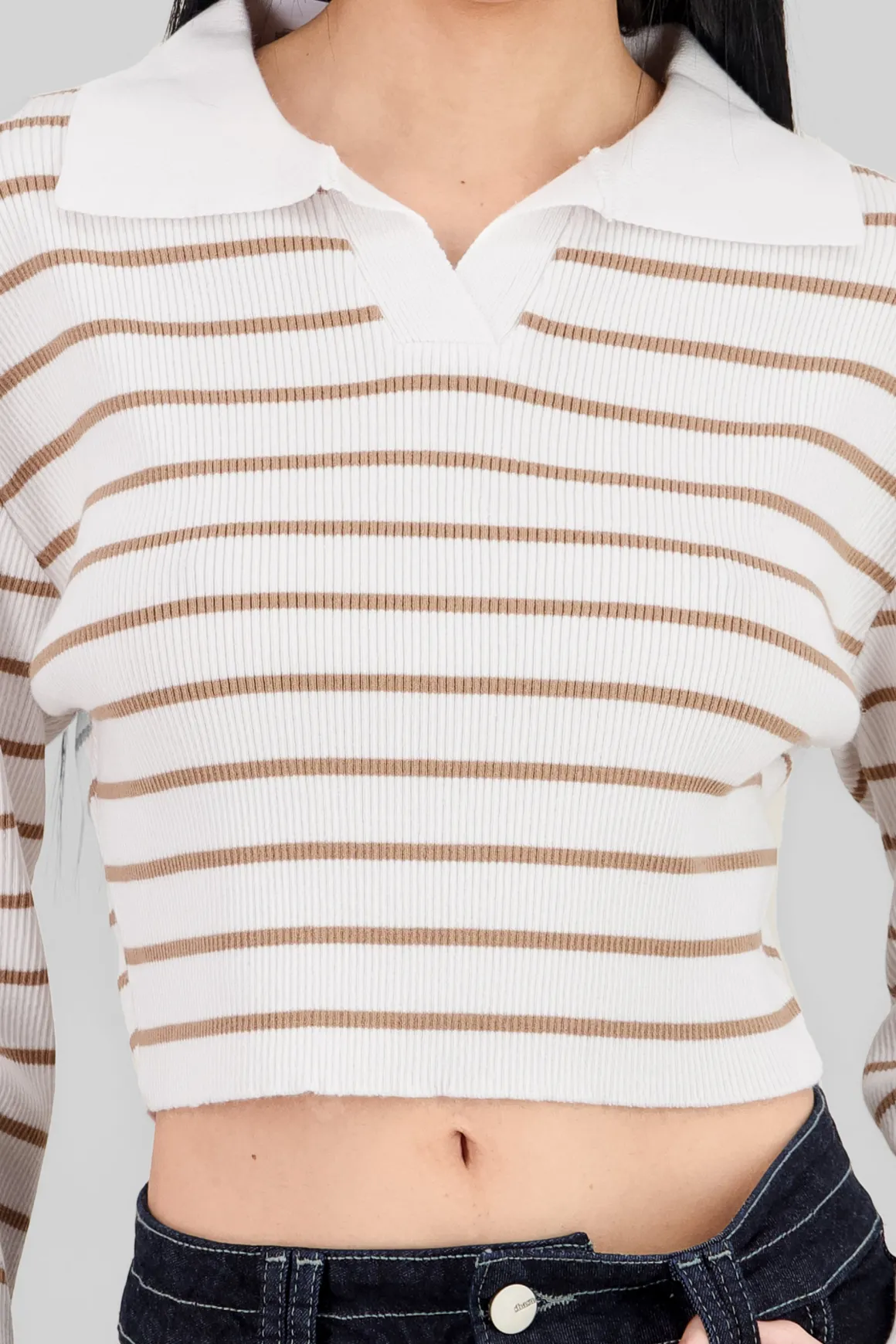 ¡Este suéter es lo que necesitas para darle un toque único a tu look! Con su cuello polo y el estampado de rayas, es perfecto para esos días frescos en los que buscas algo cómodo, pero con mucho estilo. Ideal para combinar con jeans o faldas, ¡te encantará!