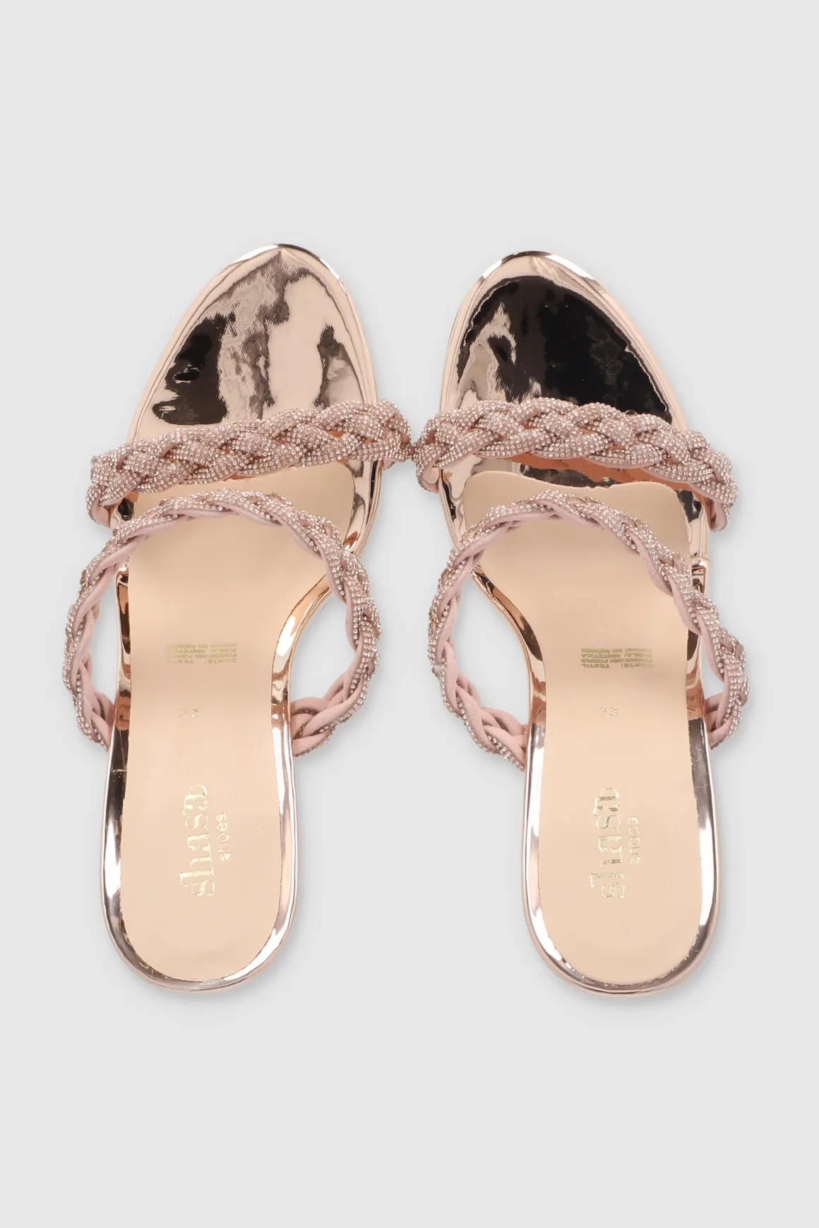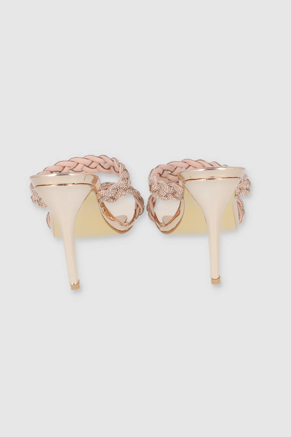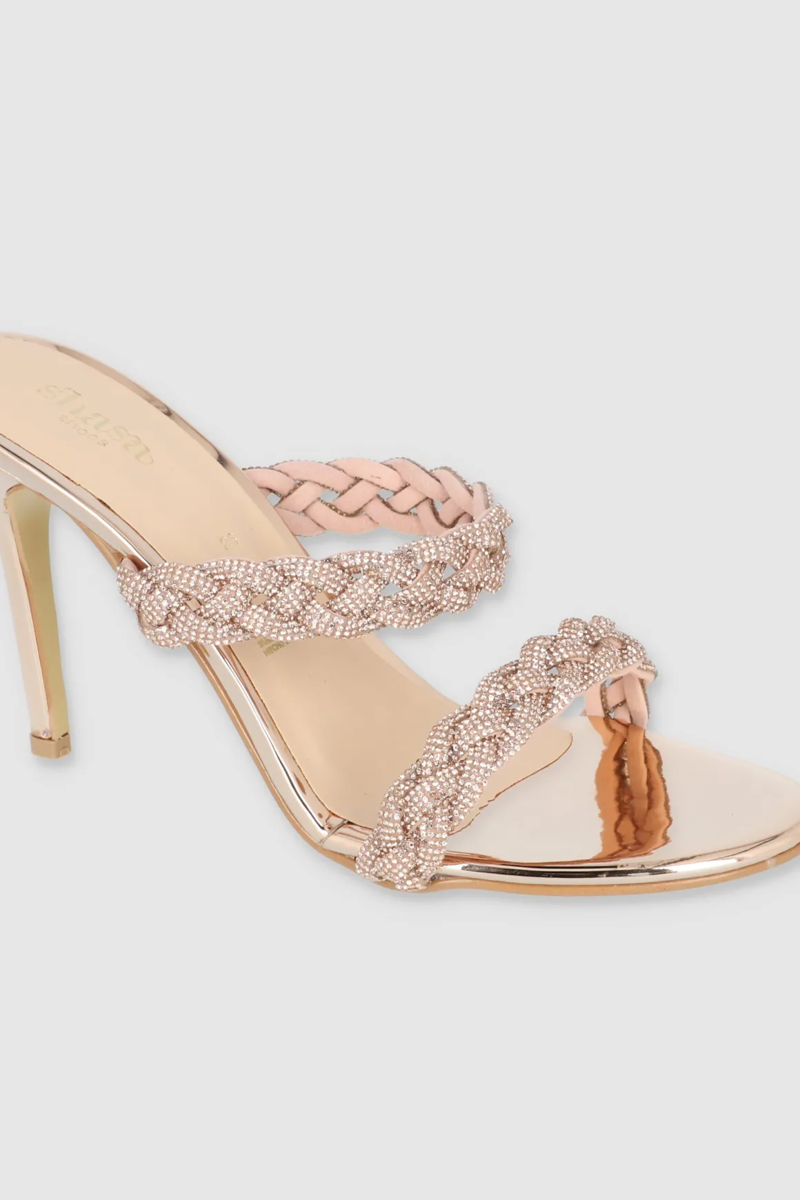 Estos tacones con detalles de trenzado y brillos son ideales para quienes buscan un toque glamuroso. El tacón delgado te dará altura sin perder comodidad.