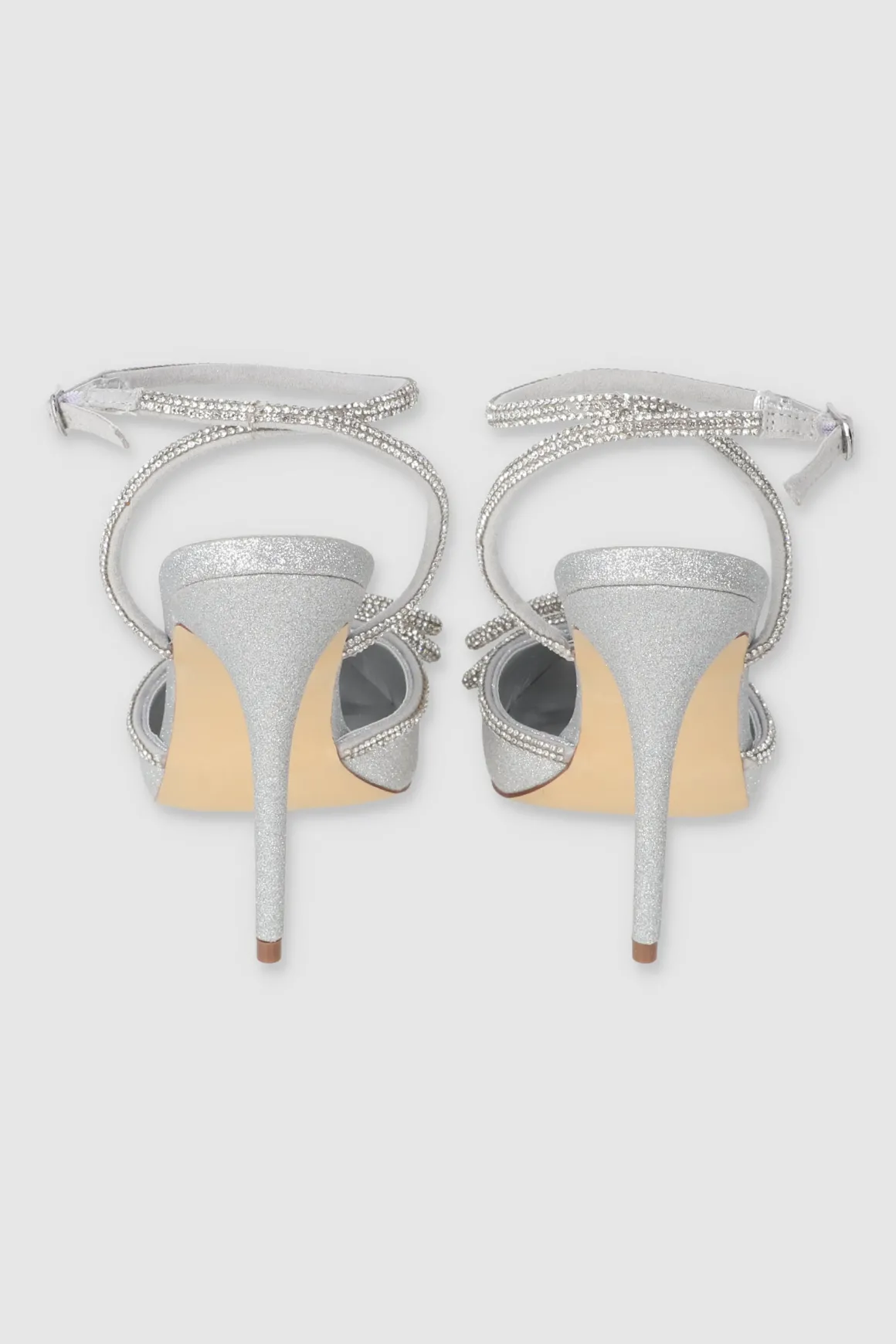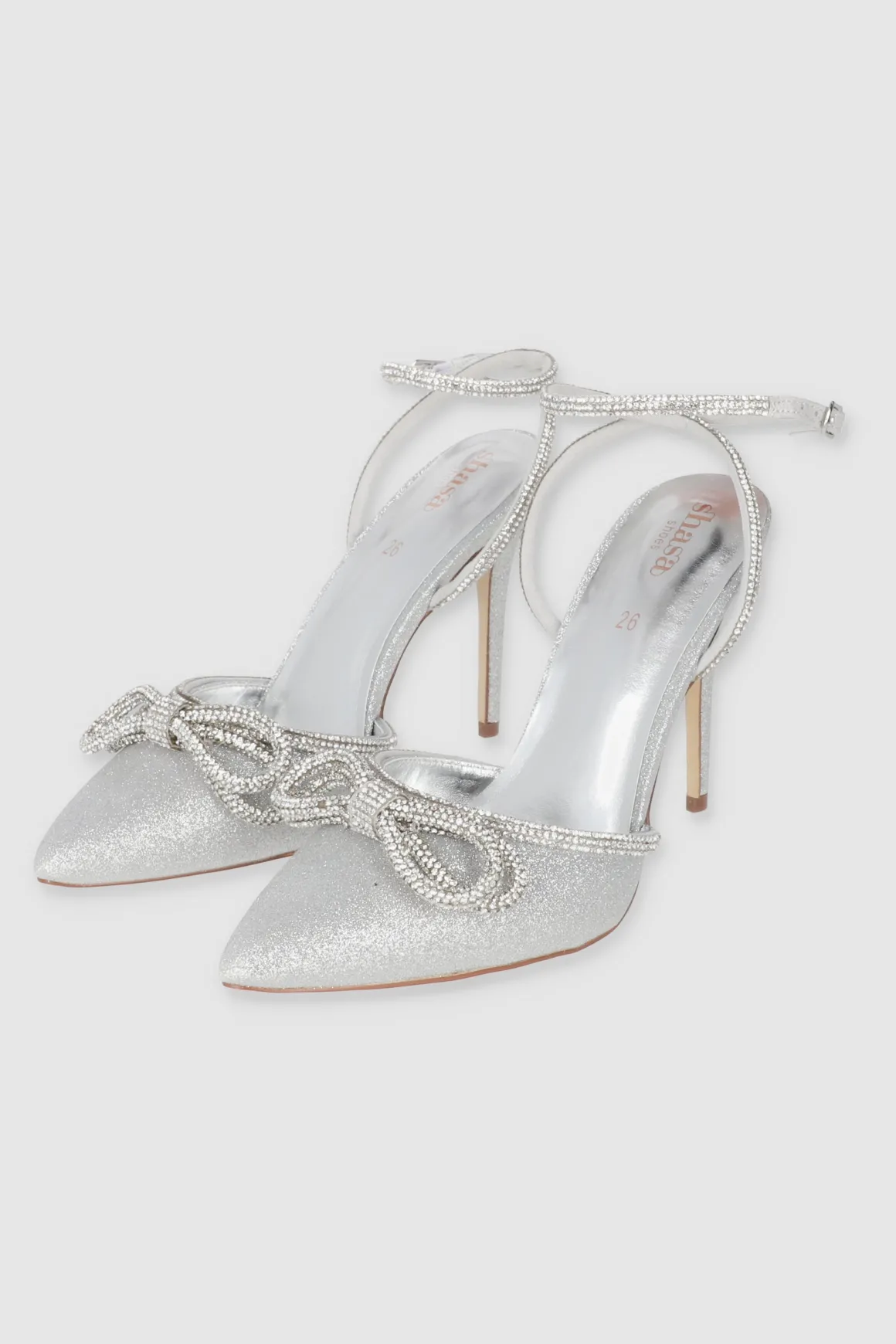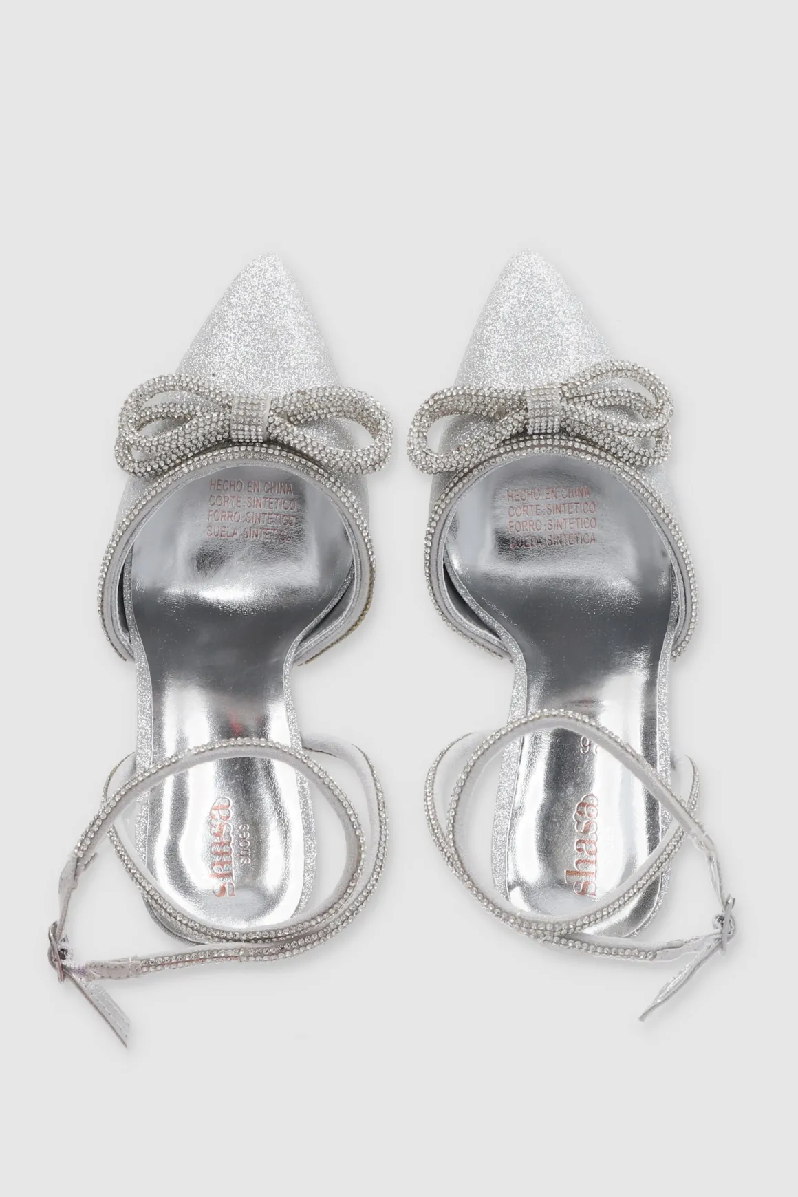 Tus pasos brillarán con estos tacones de aguja con un encantador moño y tiras cruzadas de brillos. Estos tacones son el complemento perfecto para tu look deslumbrante.