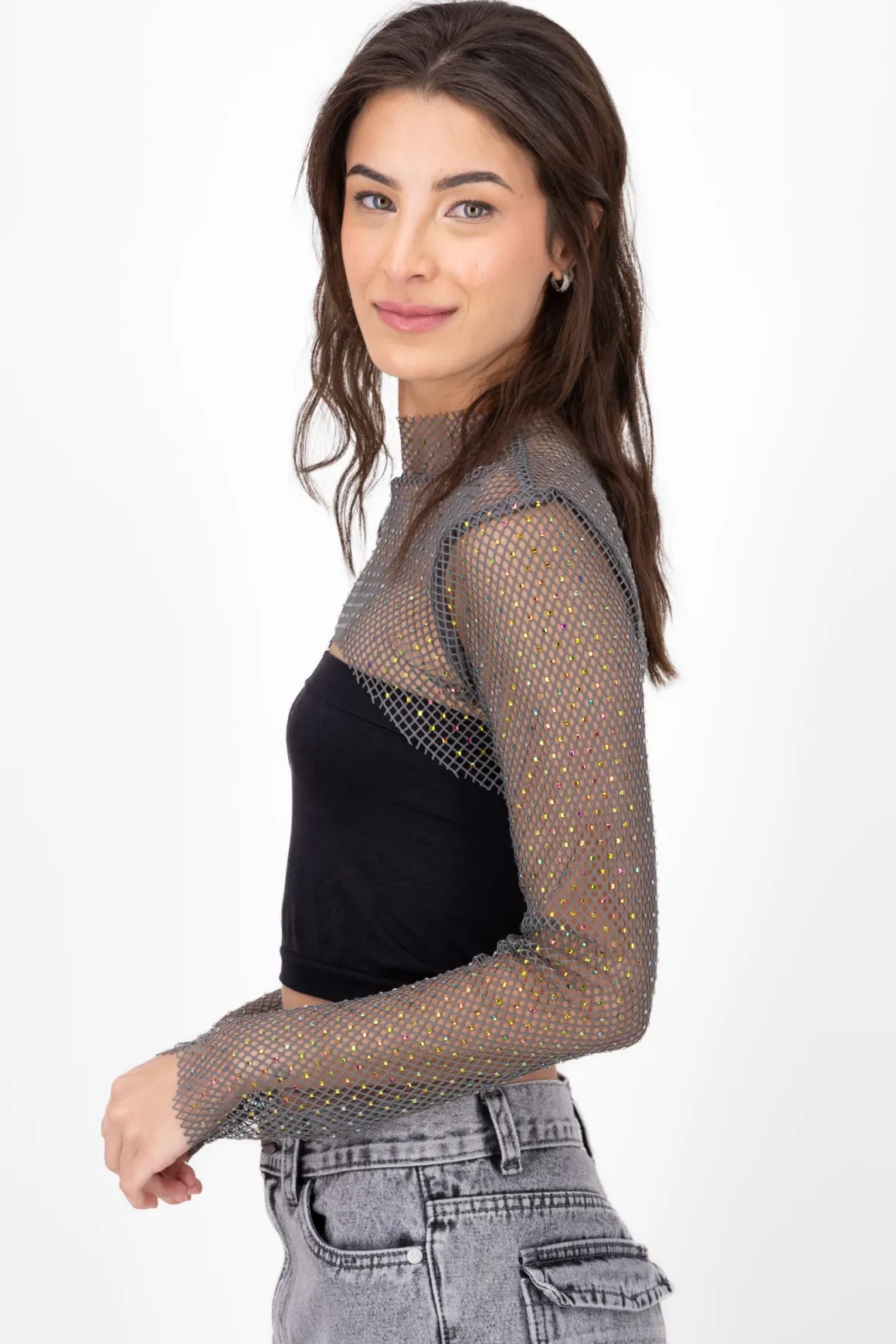 Este top crop de red está diseñado con una hermosa aplicación de brillos que le dan un toque de glamour único. Con un moderno cuello alto y mangas largas, este top es perfecto para lucir a la moda en cualquier ocasión especial.