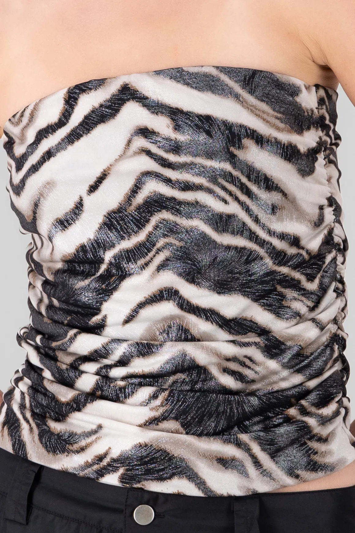 ¡Luce única con este top tubo de efecto drapeado! Con un estampado animal print, es ideal para resaltar tu estilo audaz y chic. Perfecto para combinar con jeans de cintura alta o faldas.