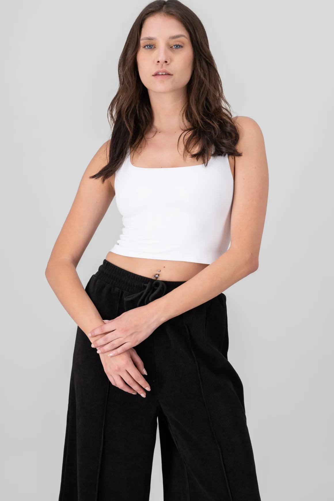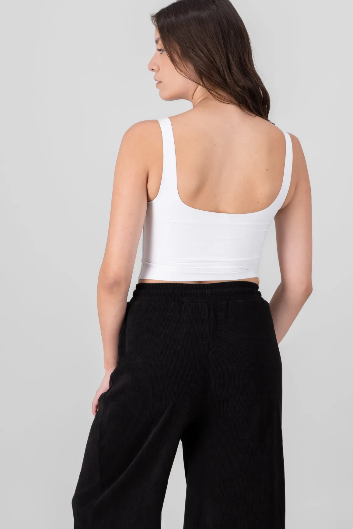 Un top básico con un toque moderno. Los tirantes anchos y el escote cuadrado lo convierten en una prenda cómoda pero con mucho estilo.