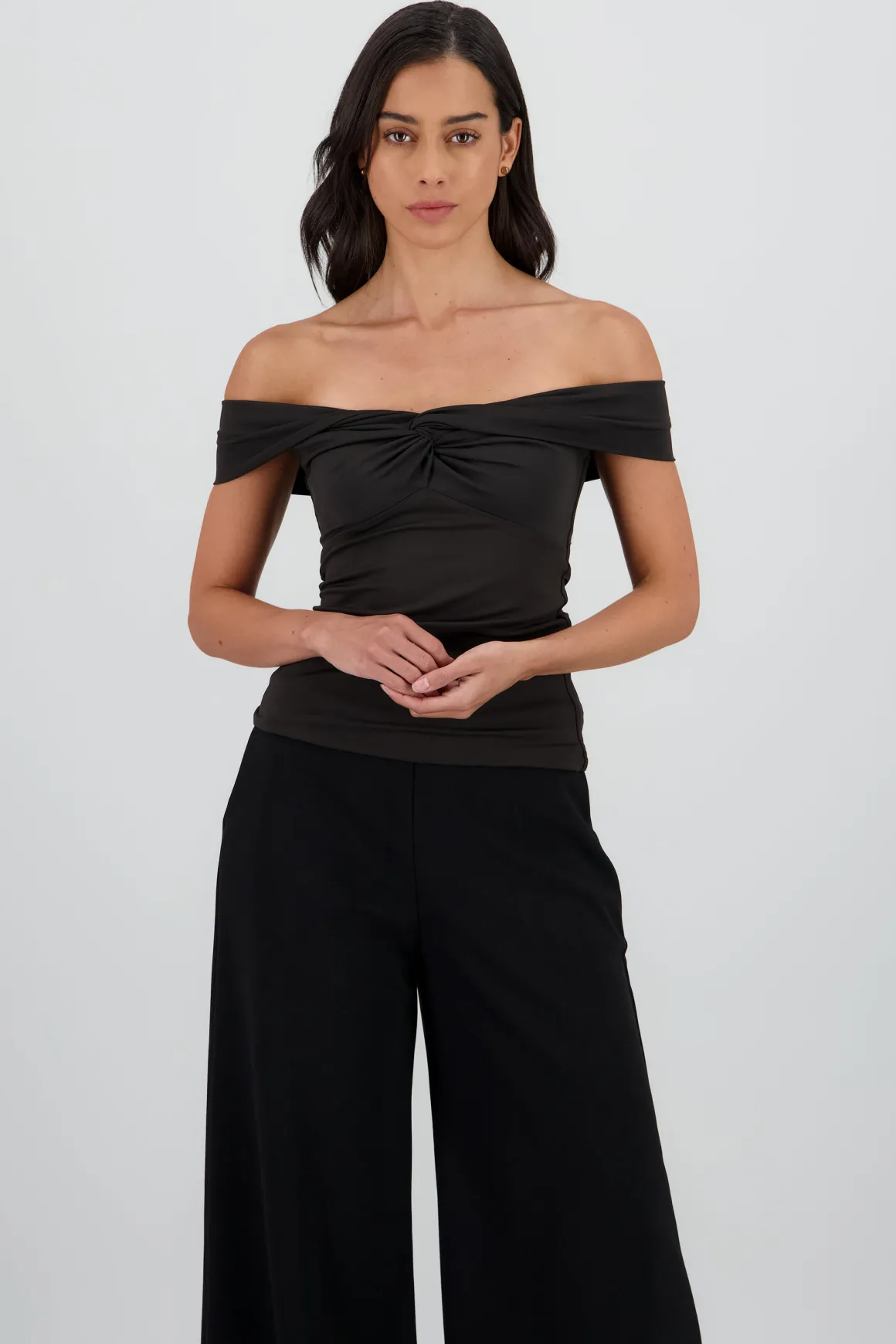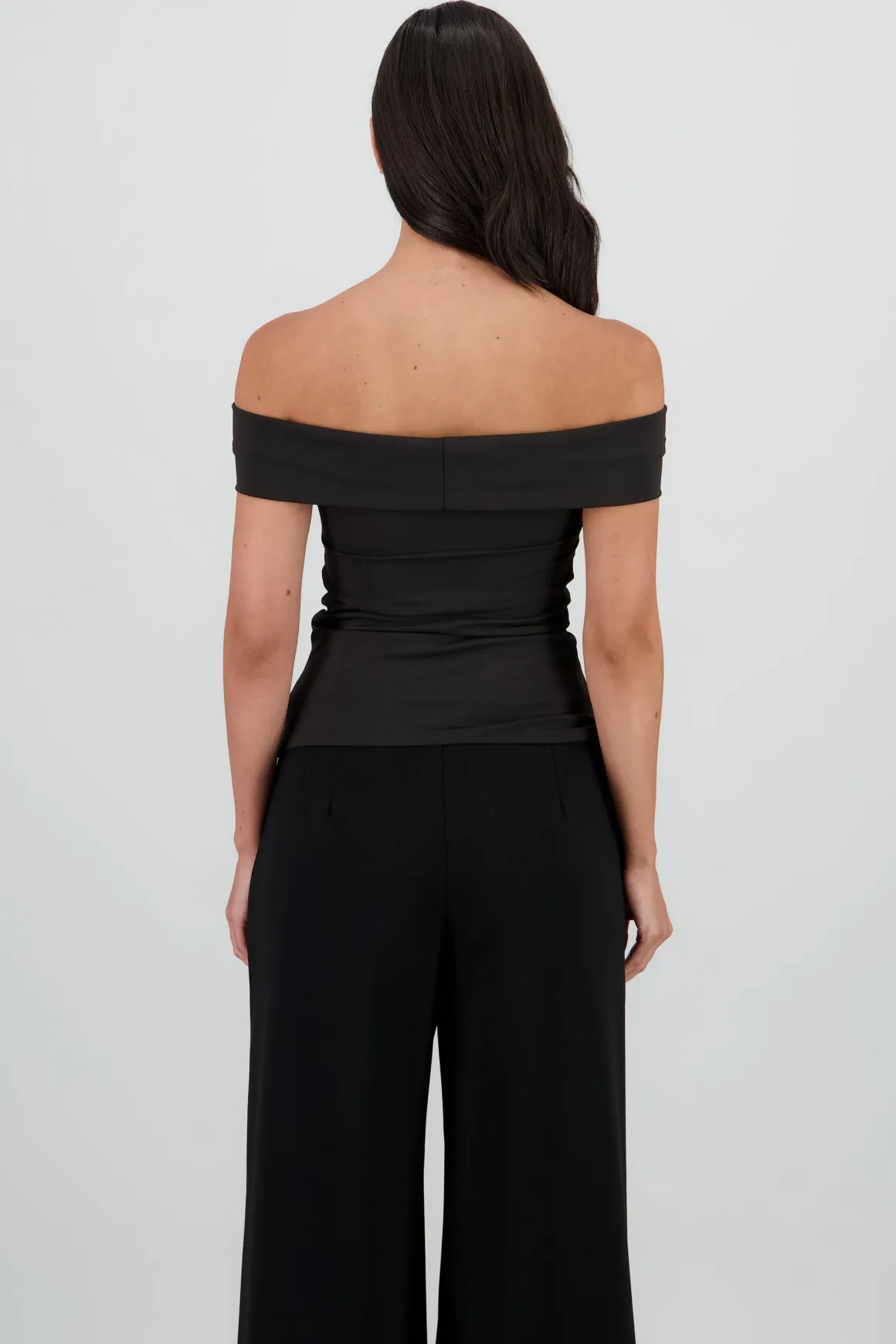 Top liso con diseño off shoulder, corte asimétrico y detalle en la parte central.