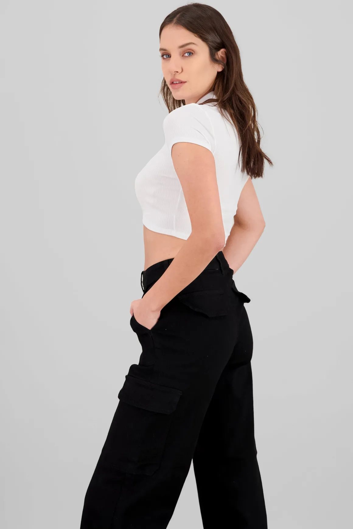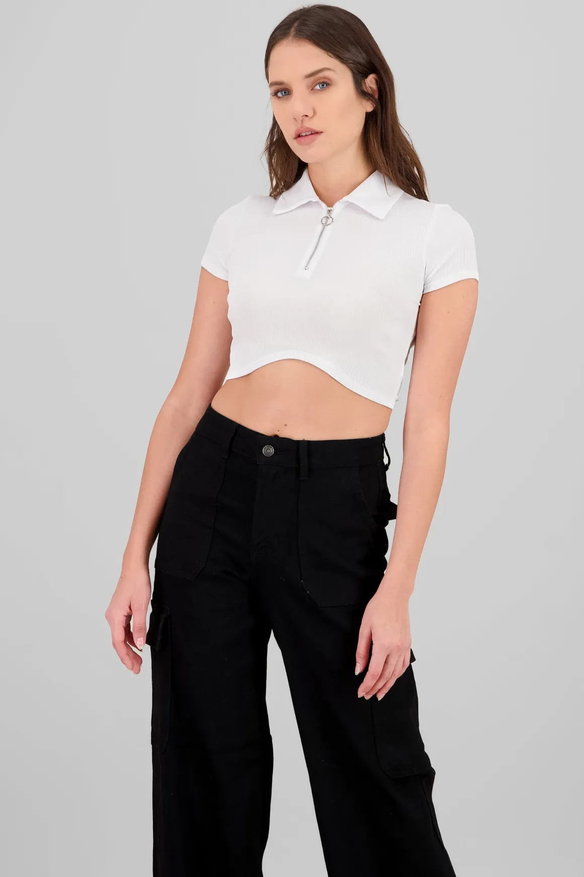 - Detalle de medio cierre para un look contemporáneo.