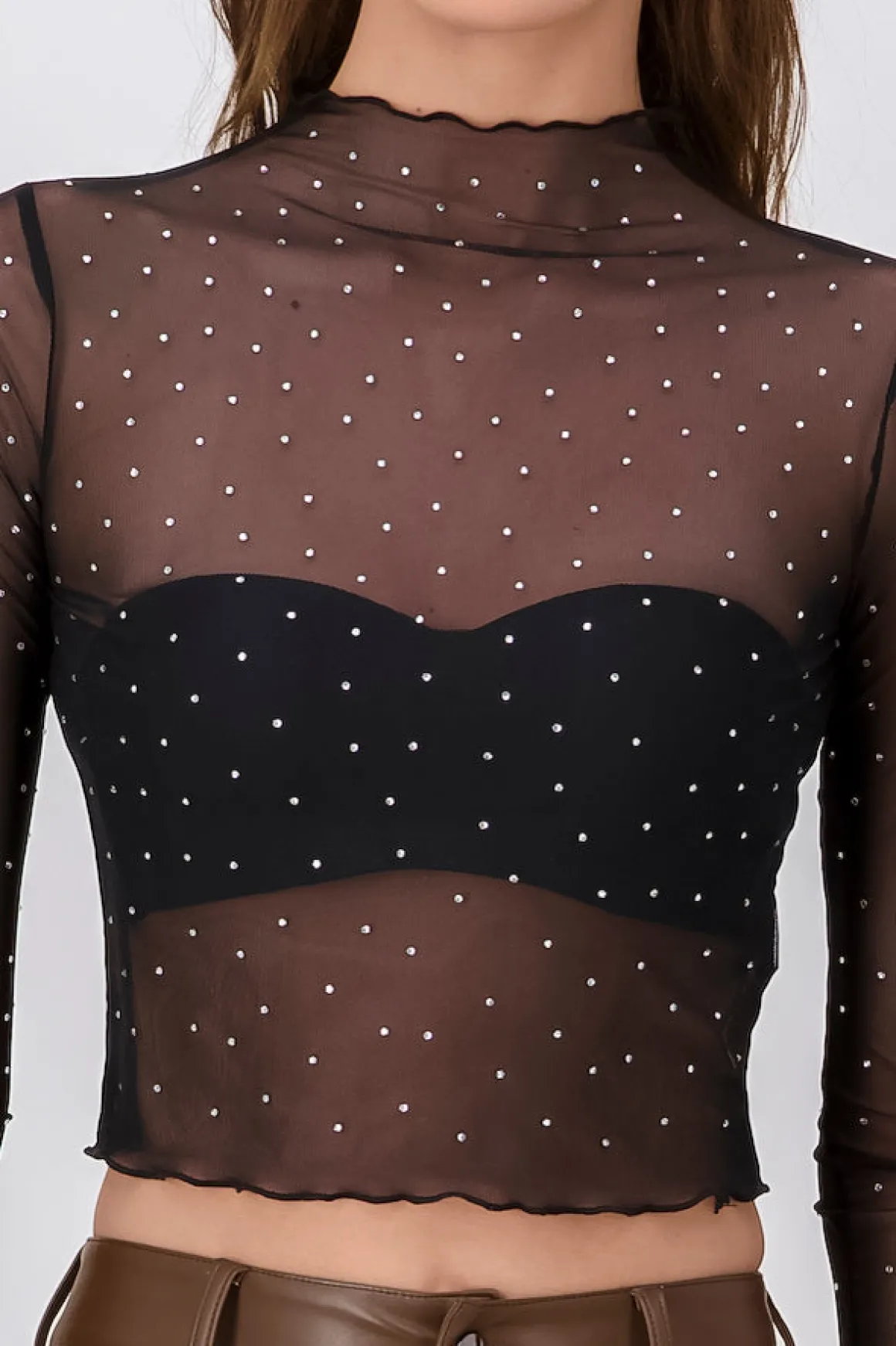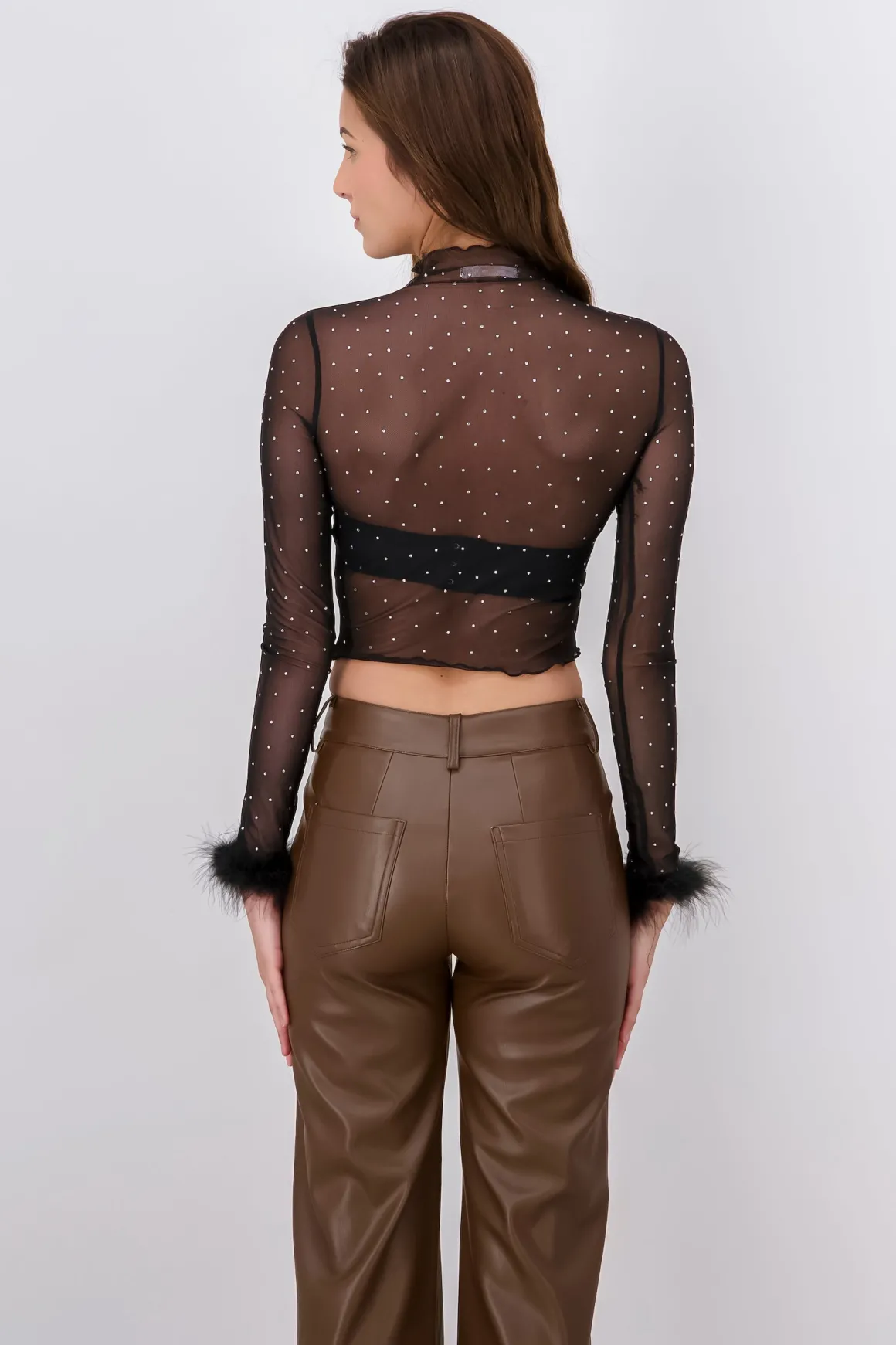 Experimenta el brillo y la elegancia con nuestro top de mesh con detalles de plumas. Diseñado para quienes desean destacar en cualquier ocasión, este top combina estilo y sofisticación en una sola prenda.