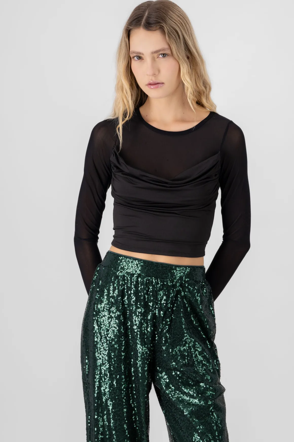 Este top mesh drapeado es perfecto para un look chic y moderno. Con su diseño liso y mangas largas, el efecto drapeado le añade un toque especial que no pasará desapercibido.