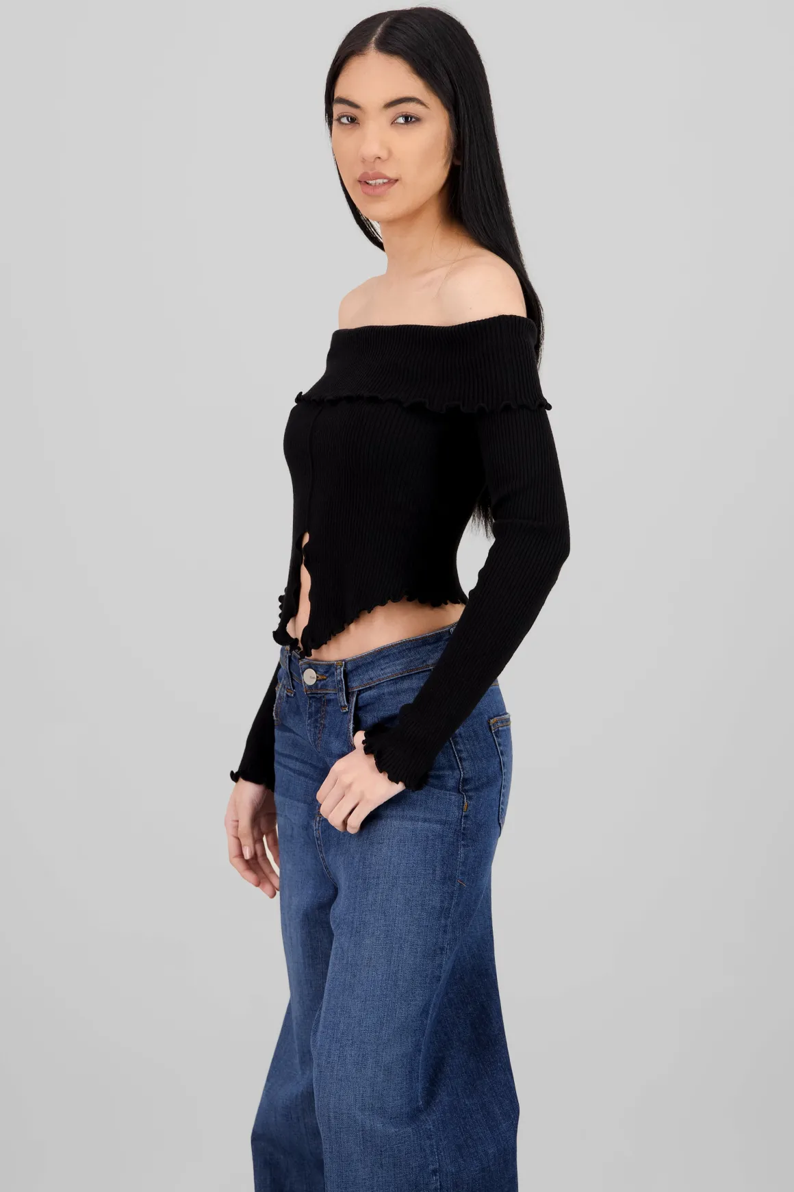 - Estilo off shoulder que resalta tus hombros.