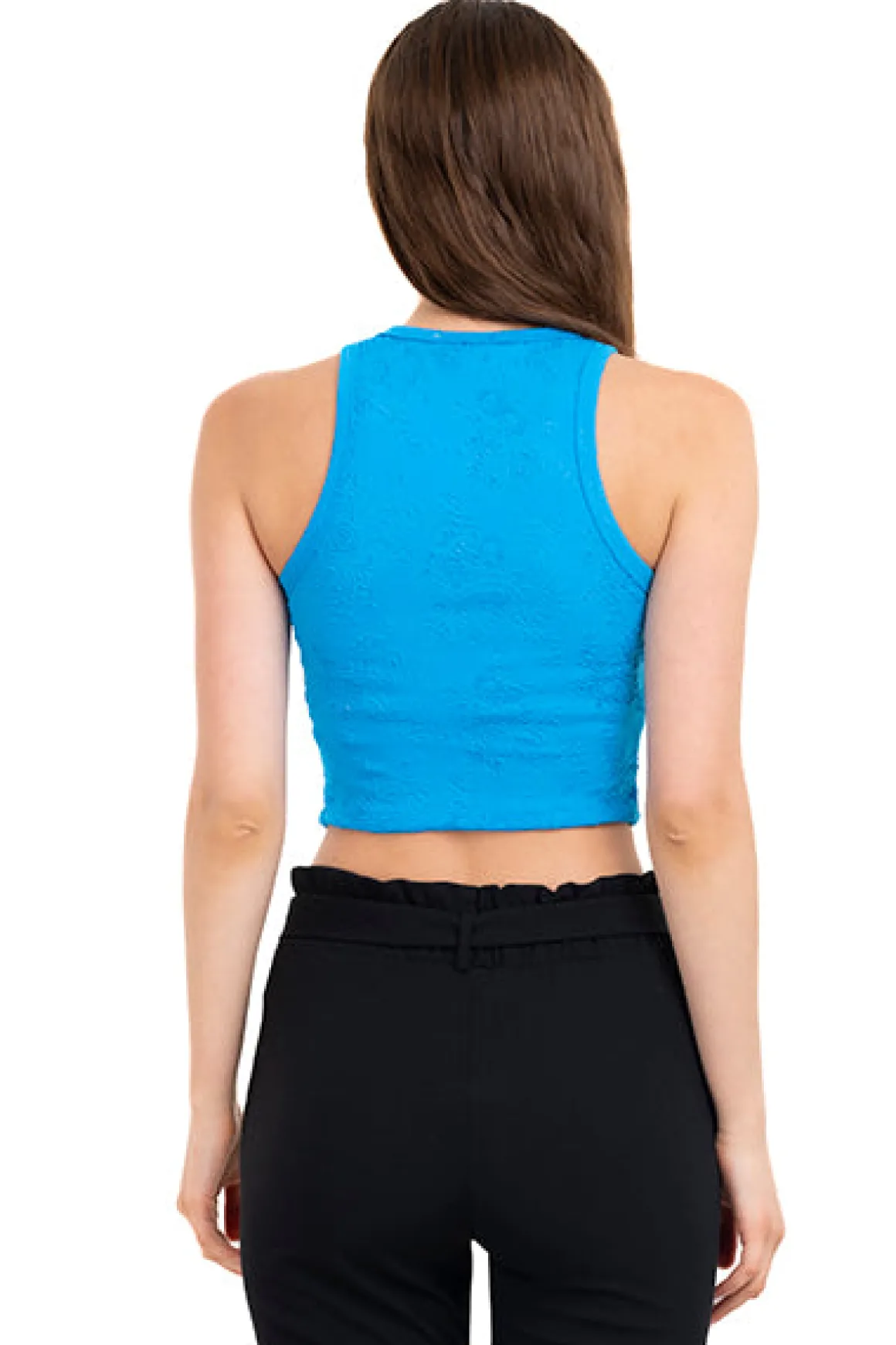 Top liso en tejido jacquard de cuello redondo sin mangas.