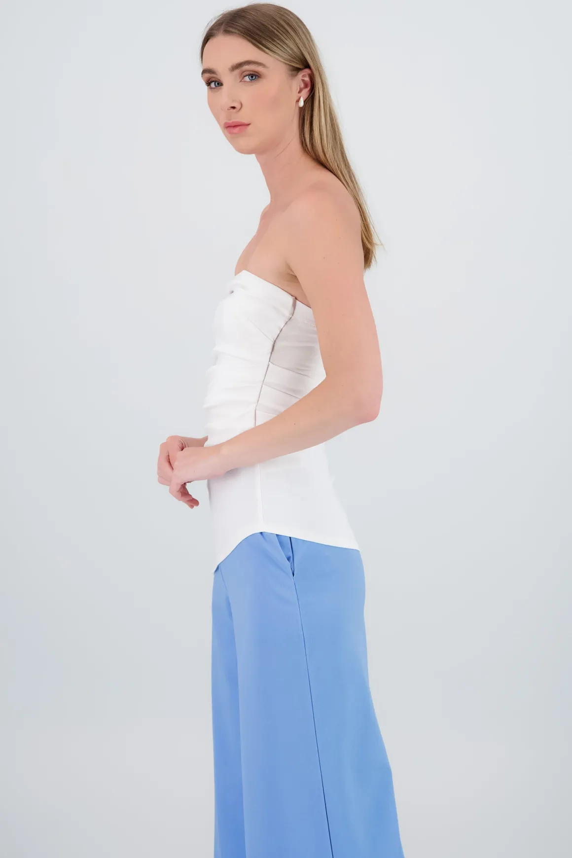 Top tubo con costado plisado, hombros descubiertos, ajuste ceñido.